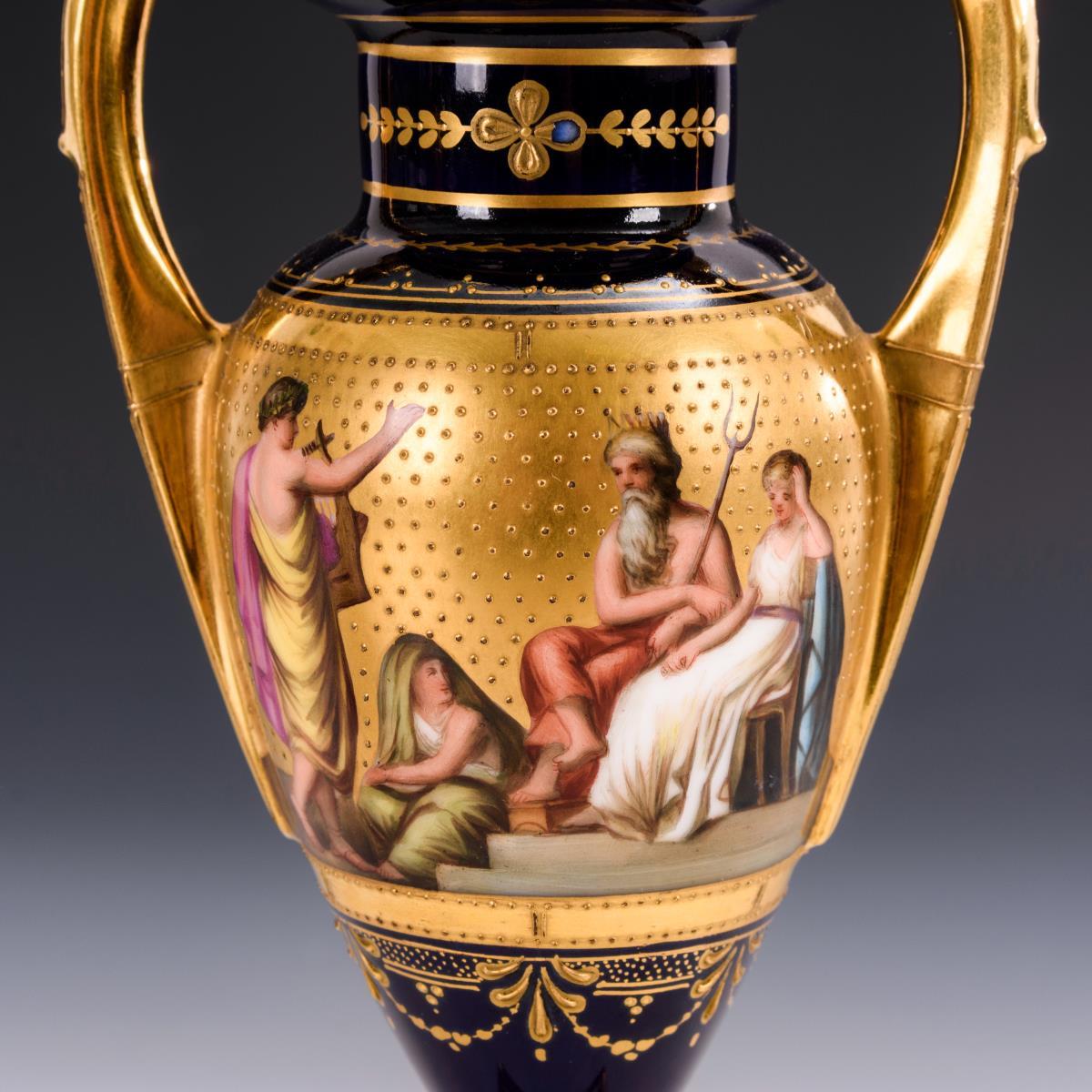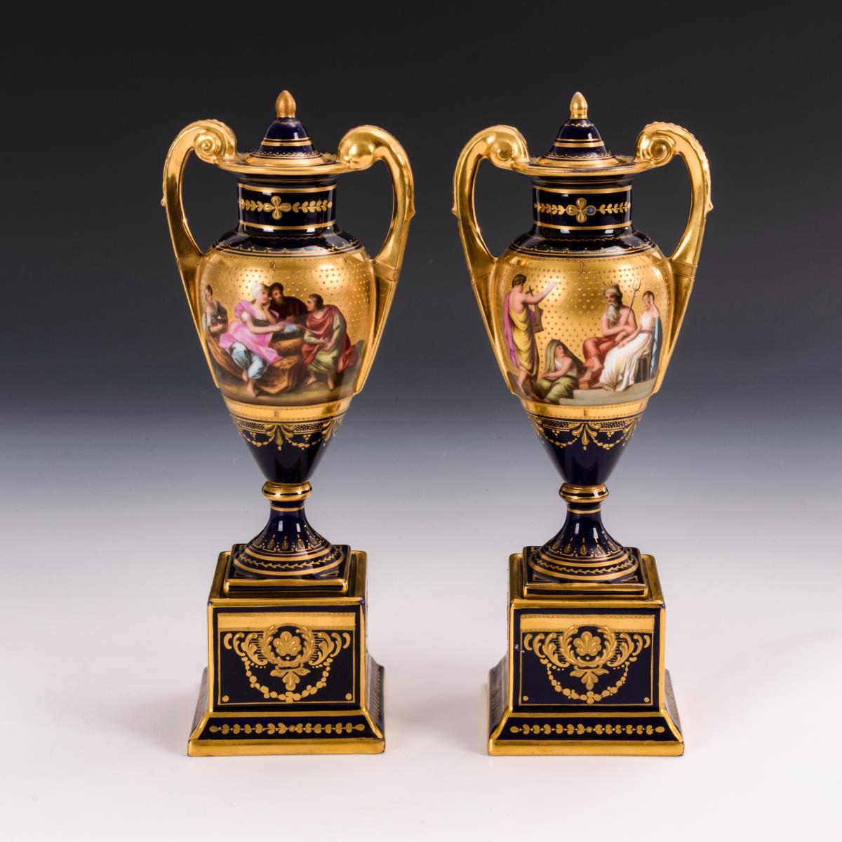 Amphorenvasen auf quadratischem Sockel. Beidseitig vor Goldfond mythologische, unterseitig bezeichnete Szenen. 1 Knauf restauriert, partiell minimalster Goldabrieb.
