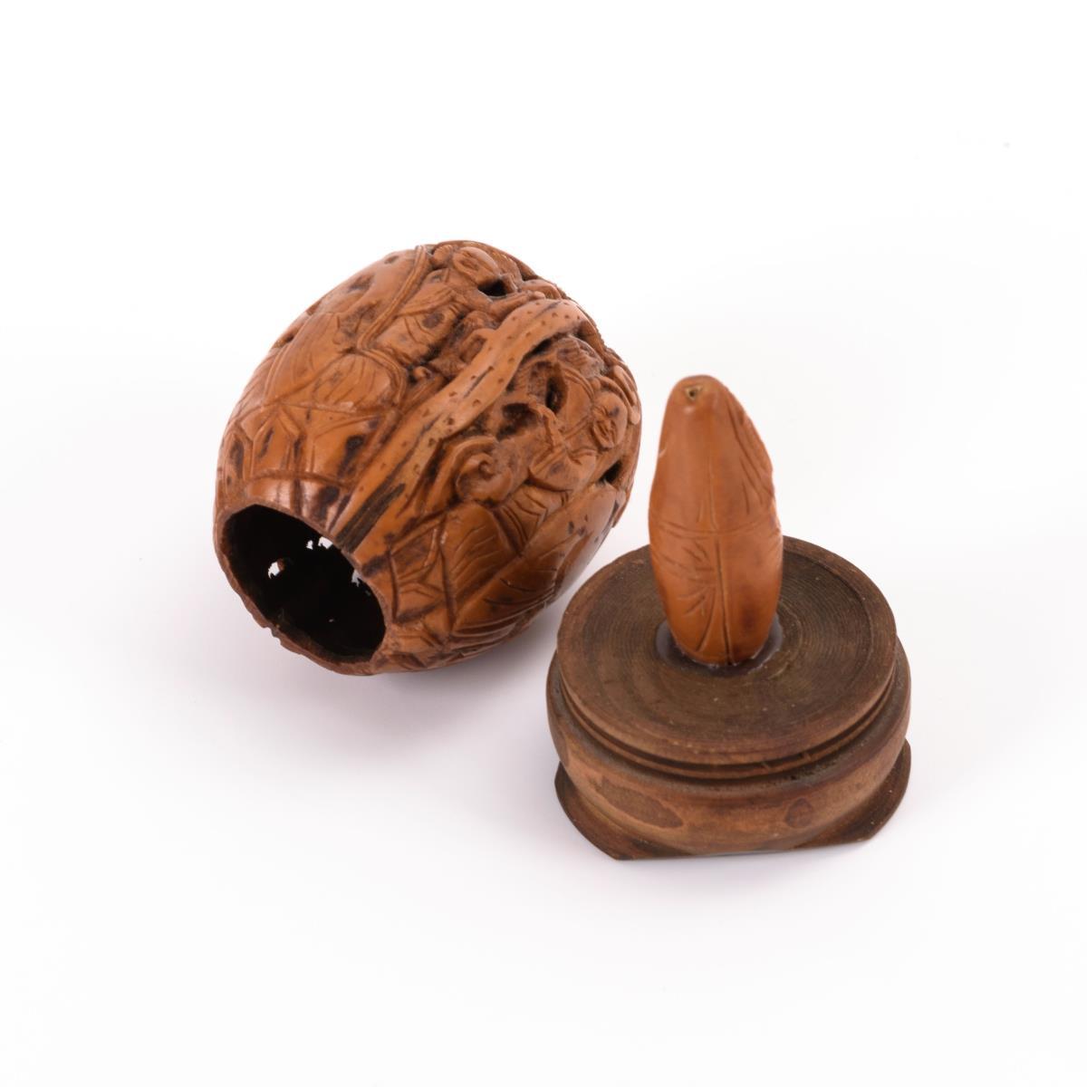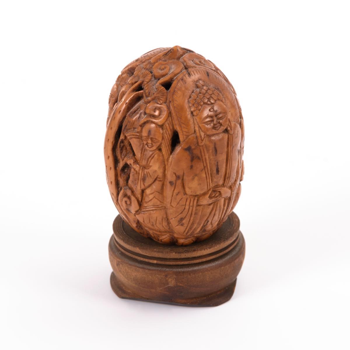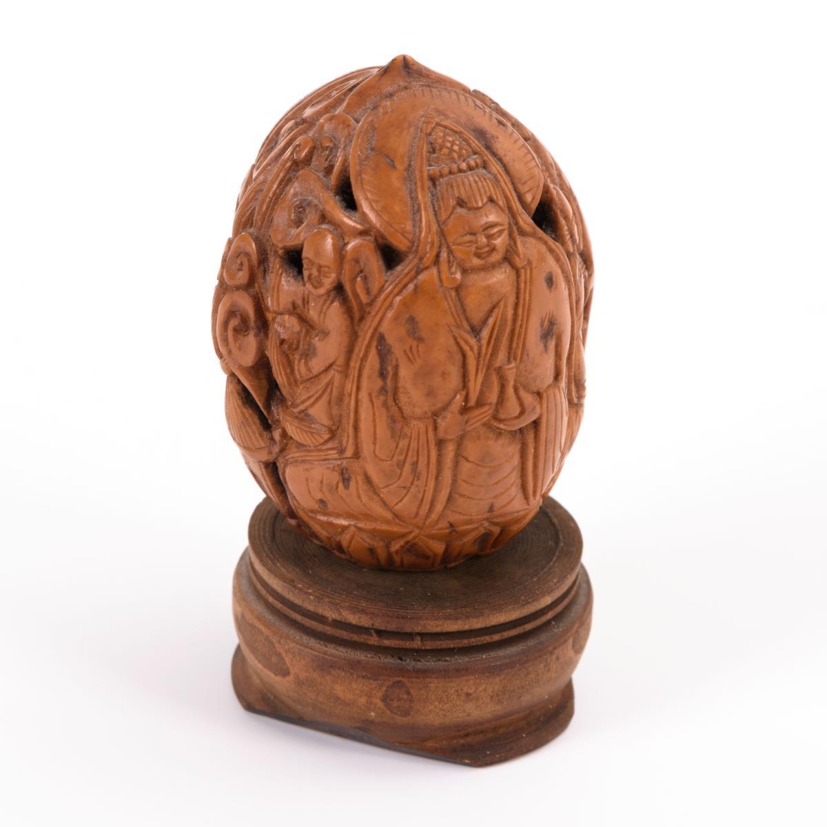 Ausgehöhlte Nuss mit feinem Figurenrelief, an wenigen Stellen durchbrochen gearbeitet. Auf kleinem Sockel mit Zapfen.