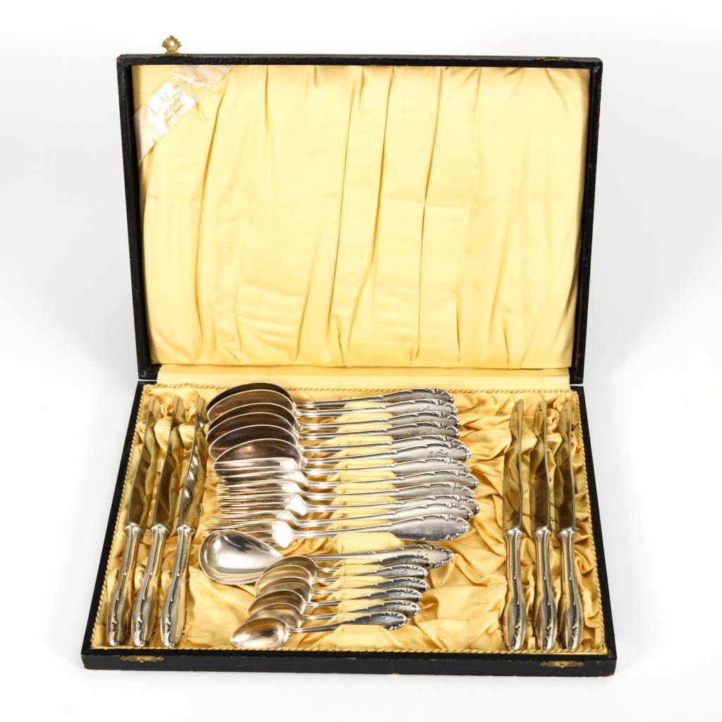 6 Messer, 6 Gabeln, 6 Esslöffel, 6 Kaffeelöffel, 1 Gemüselöffel. Runde Form mit floralem Reliefrand, alle Löffel monogrammiert "HL". Minimale Gebrauchsspuren.