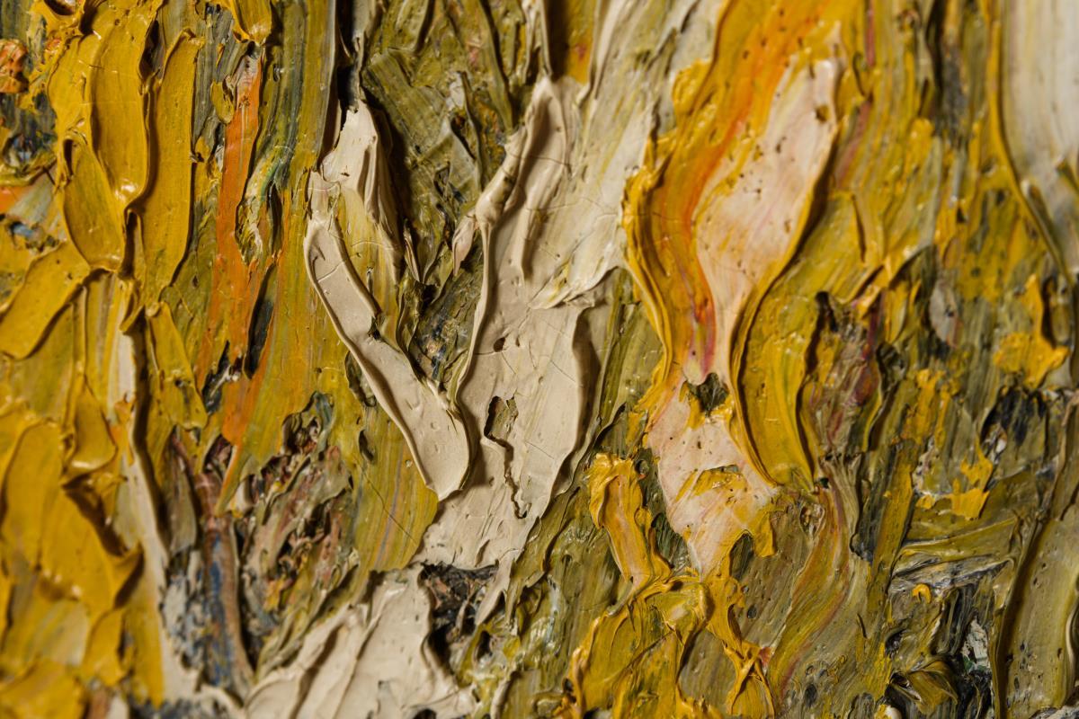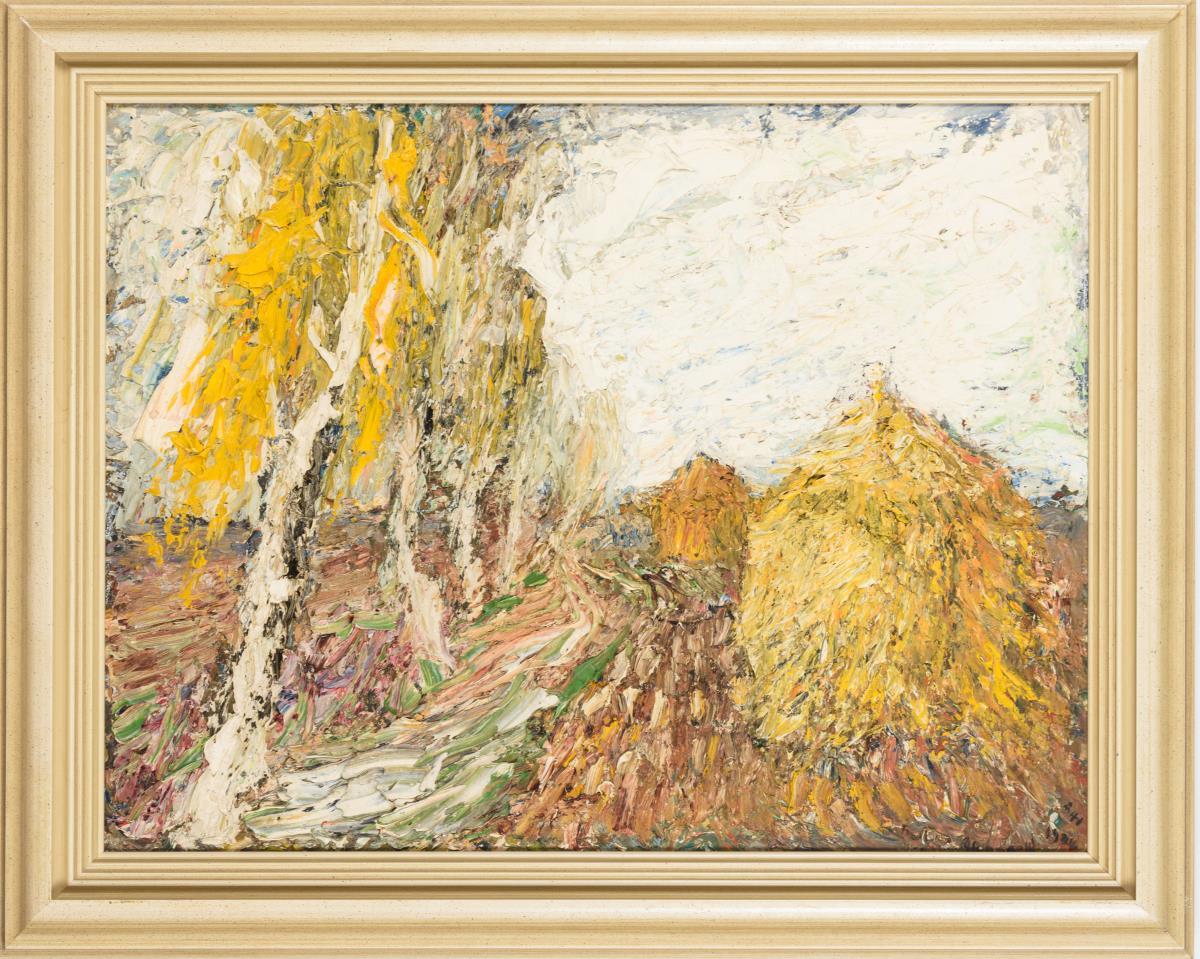 Pastos gespachtelte Herbstlandschaft mit Kornhocken unter grauem Himmel.