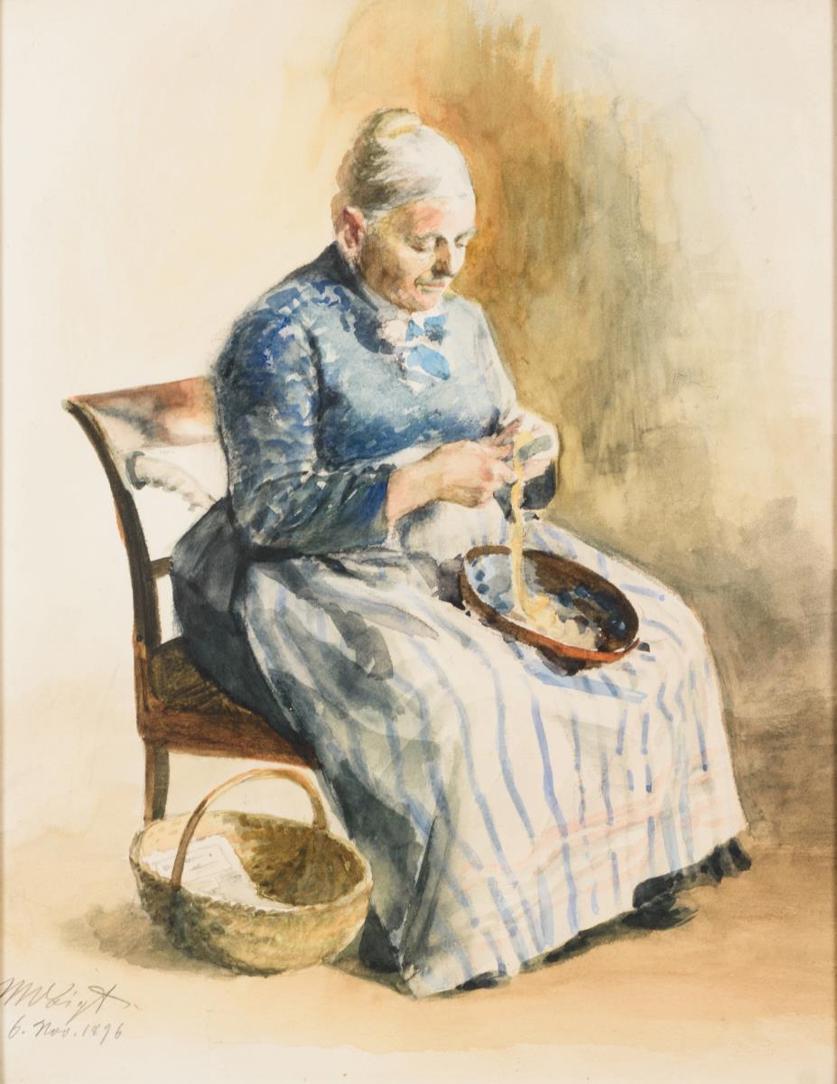 Ältere Frau beim Kartoffeln schälen sowie Porträt eines älteren Mannes beim Spielen der Flöte.