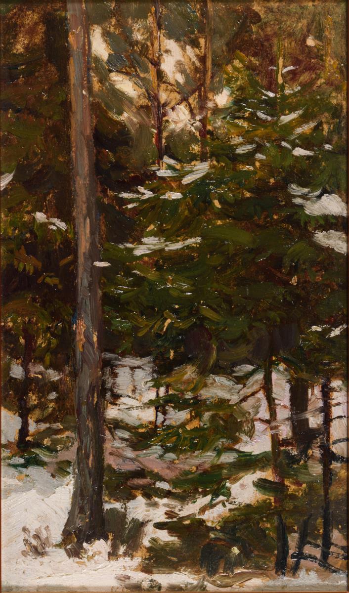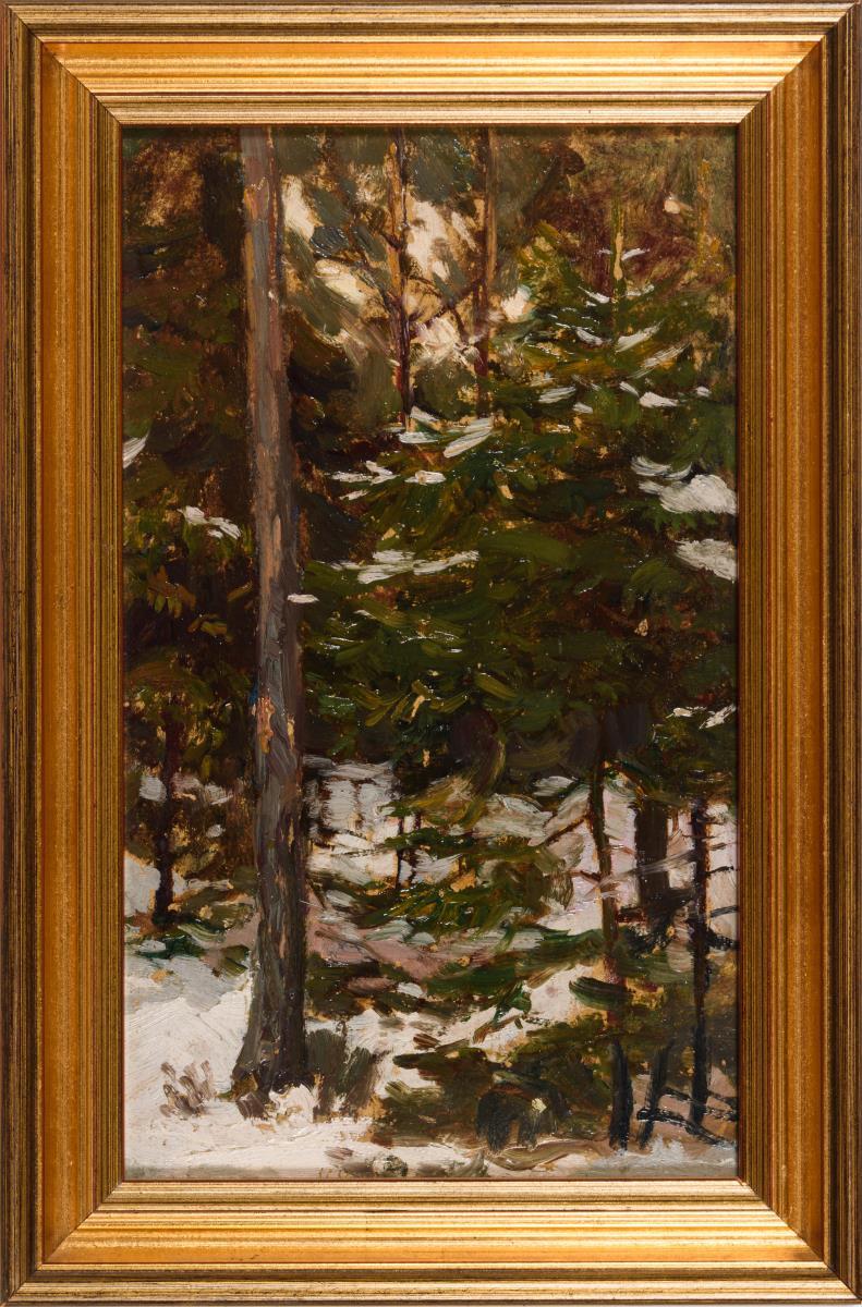 Kleine Studie mit verschneitem Waldhang.