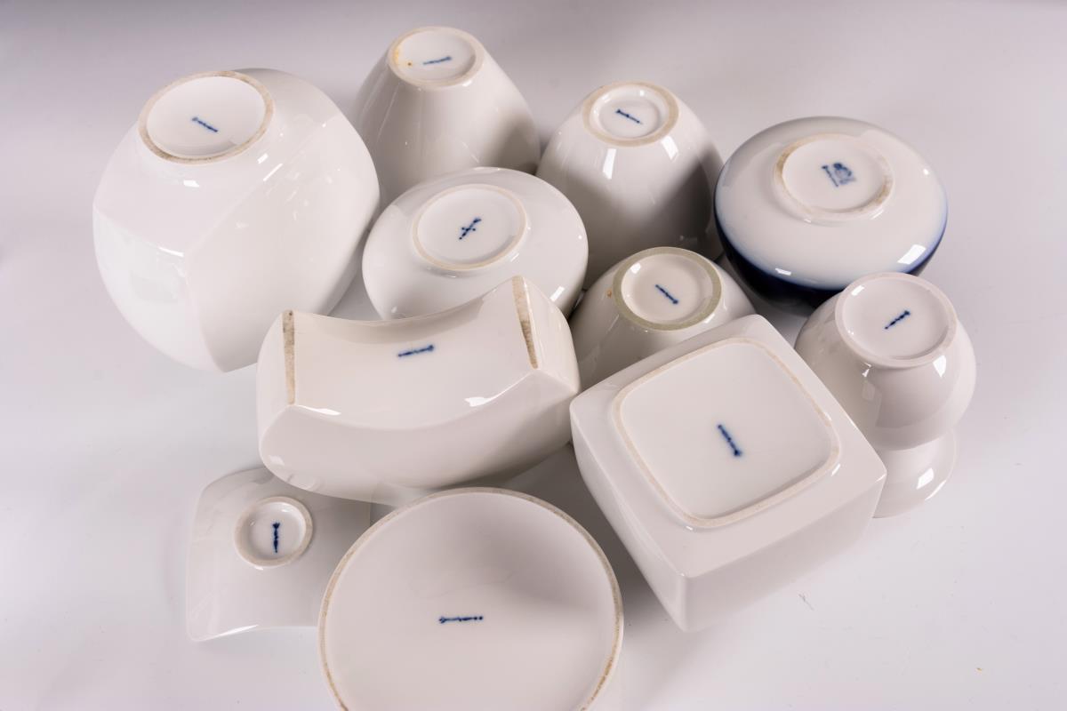 6 überwiegend moderne Vasen (u. a. Entwurf von Trude Petri; H 9-15,5 cm) sowie 5 verschiedene Schalen (darunter 2 Ascher, Zylinderschale; H 2,5-8,5 cm).
