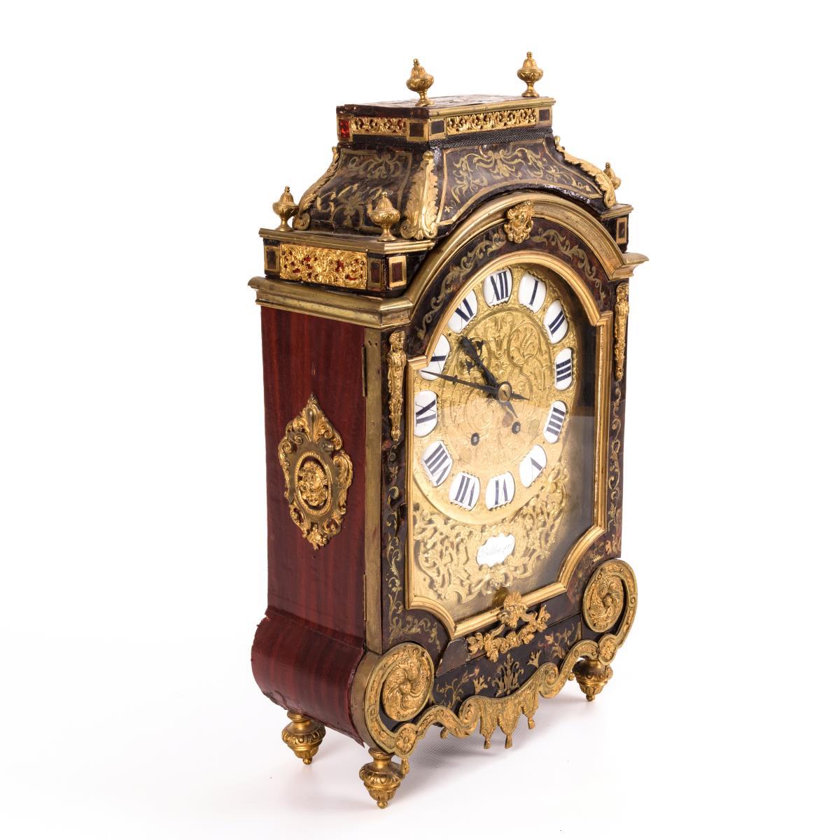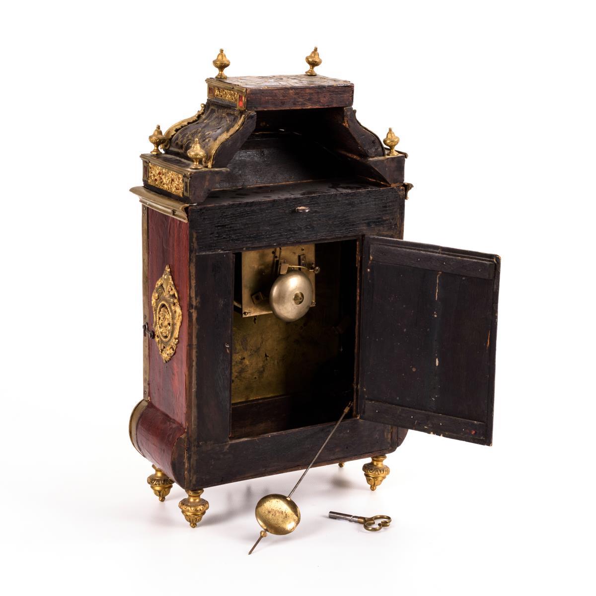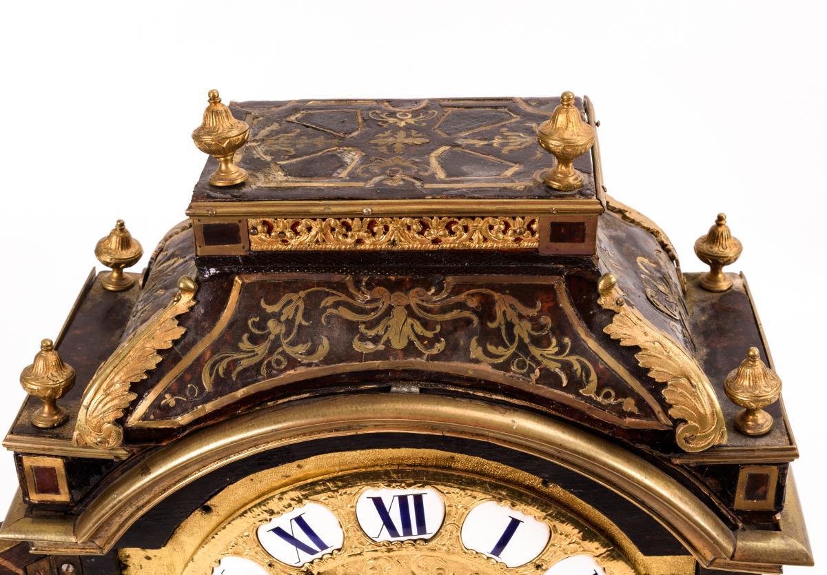Stutzuhr mit verglaster Rundbogenfront und aufgesetztem Walmdach mit Urnenzier. Gehäuse mit floralen Marketerien im Boulle-Stil, Goldleisten und reliefierten Messingapplikationen. Läuft nicht. Restauriert, Reparaturen, Ergänzungen, Defekte.