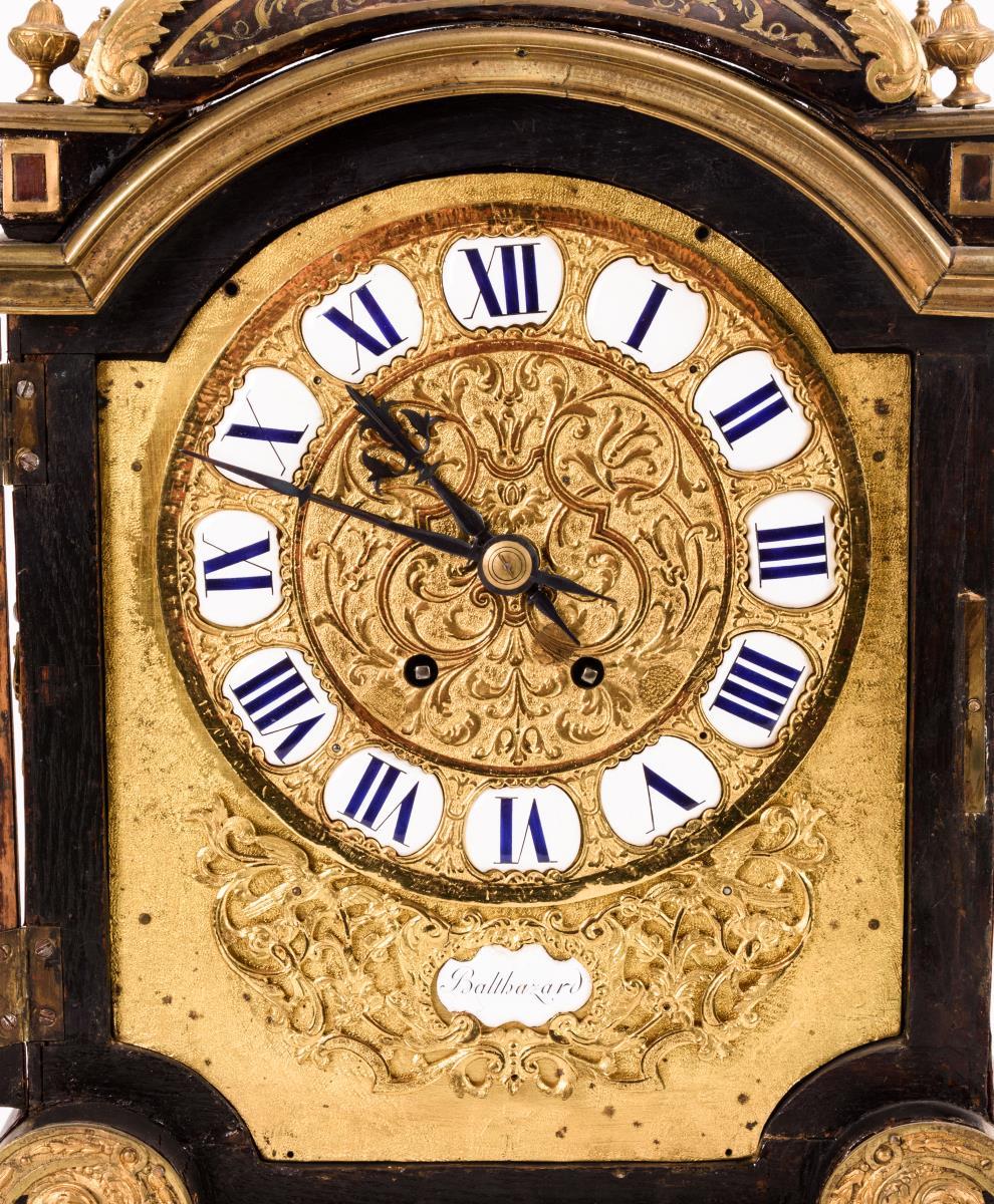 Werknummer: 29505 69. Messingwerk mit Schlag auf Glocke. Herstellerprägung Werk: S. Marti & Cie. Weiße Emailkartuschen mit blauen römischen Ziffern auf ziselierter Messingfront, Romaines-Zeiger aus Eisen. Herstellerprägung Anzeige: Balthazar.