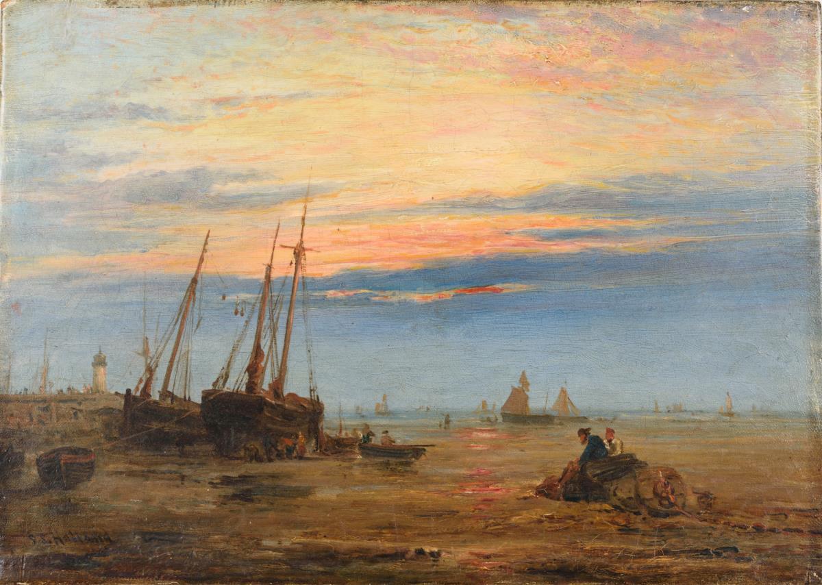 Fischer am Strand mit den Booten bei untergehender Sonne. Leichte Altersspuren.