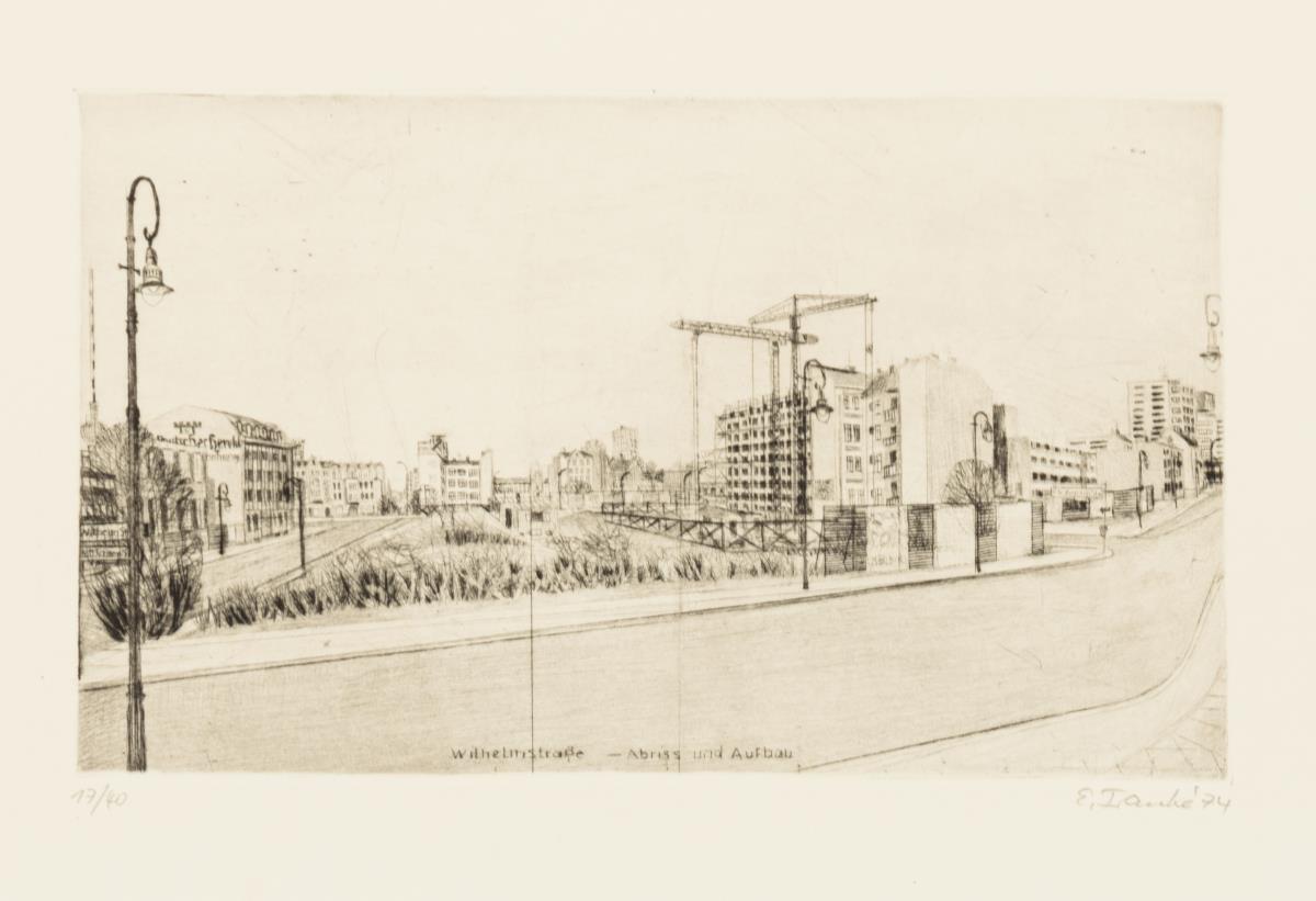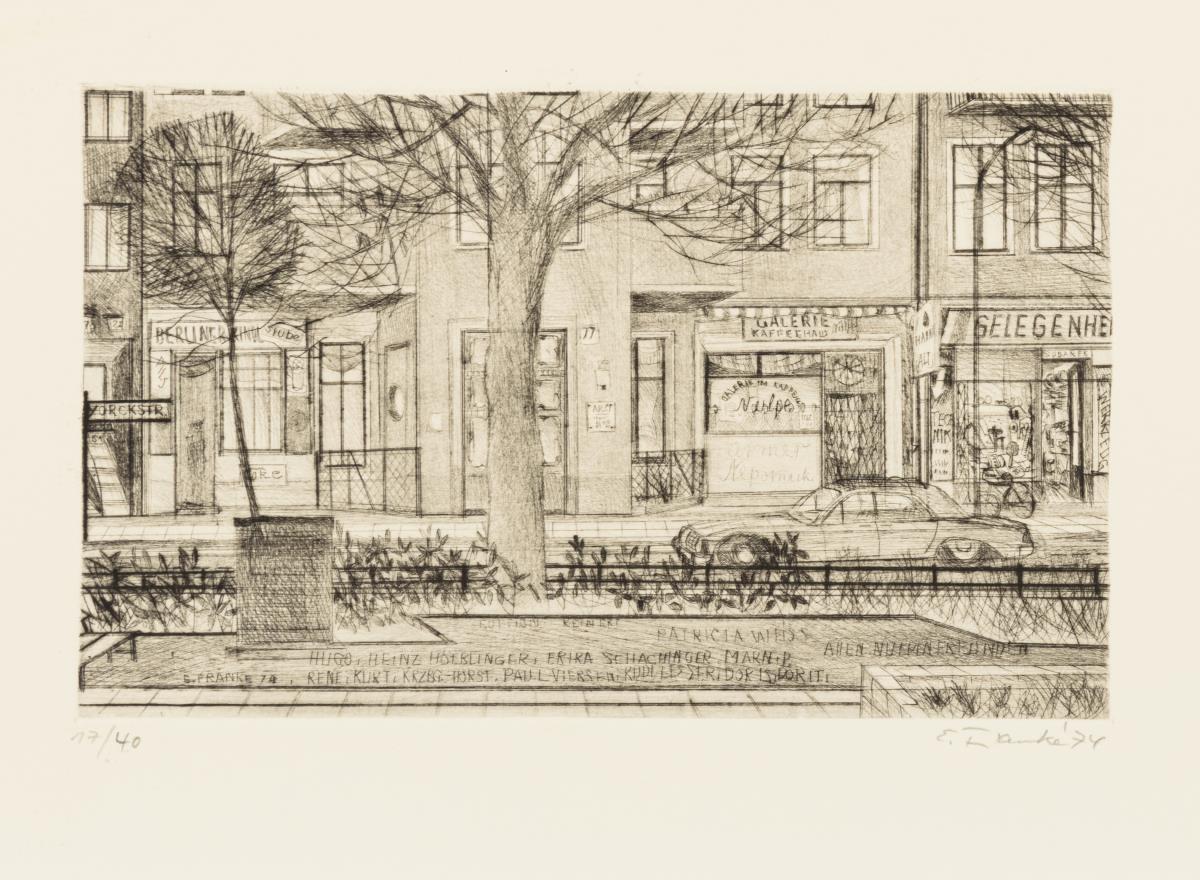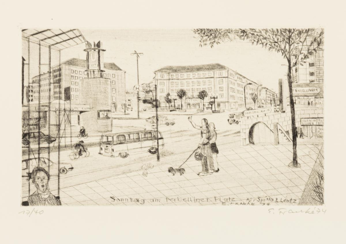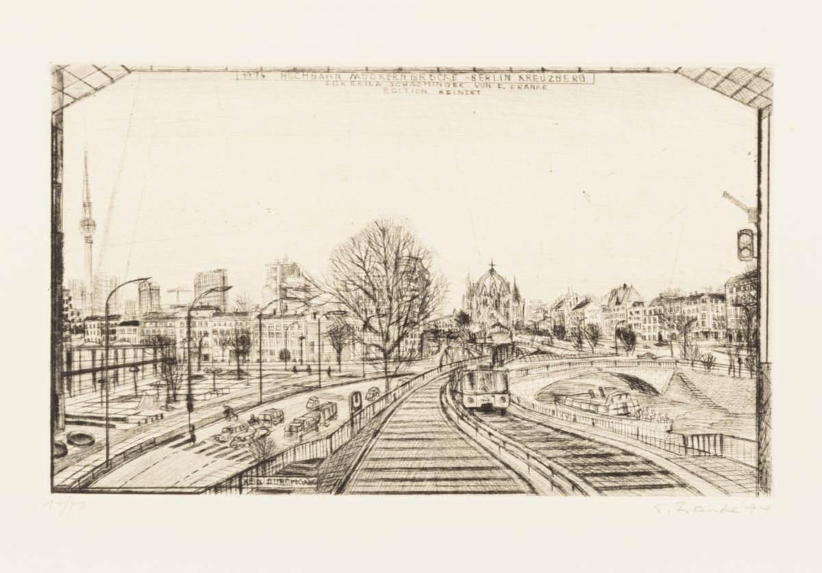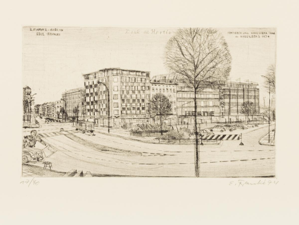 10 Radierungen und 2 Beiblätter in Original-Pappmappe: "Möckernbrücke", "Stadtanhalter", "Für Rudi Lesser", "Dank an Hertie", "Gedenkbibliothek", "Hansaviertel", "Wilhelmstraße", "Berlin-Lankwitz", "Kaffeehaus Nulpe" und "Untergrundbahn".