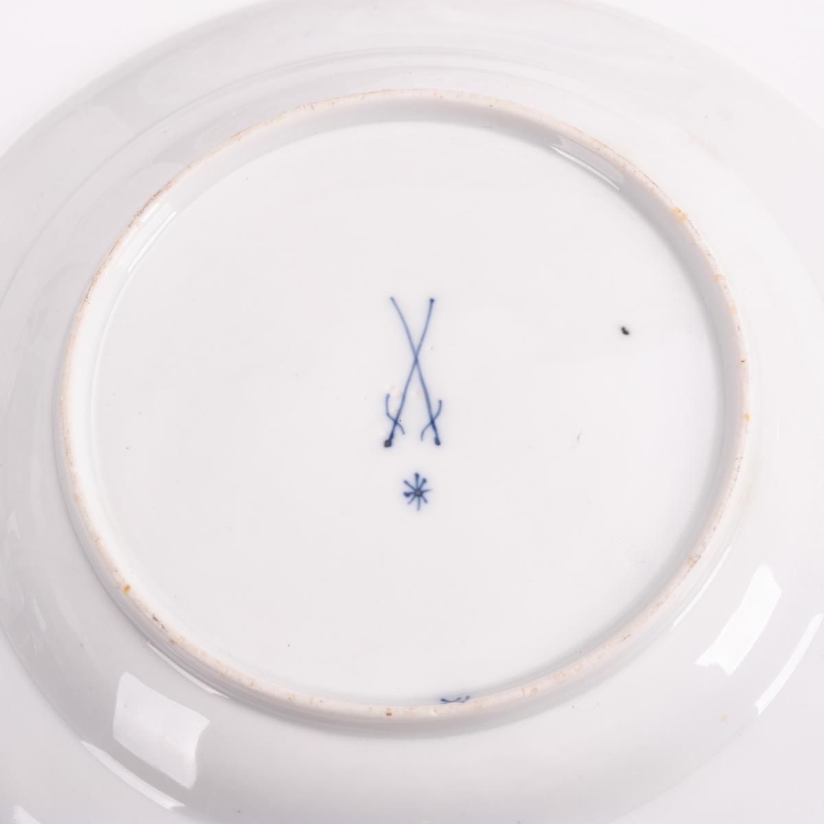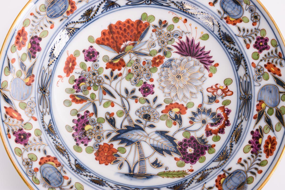 Unterglasurblau bemalt, in Rot, Purpur, Grün und Schwarz staffiert, goldstaffiert. Ø 24 cm.