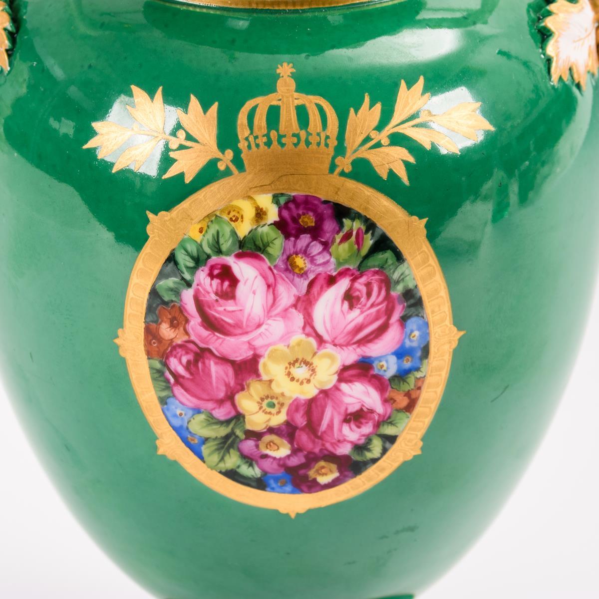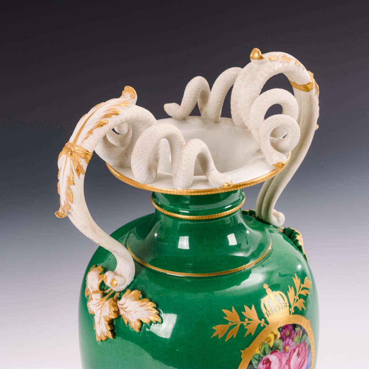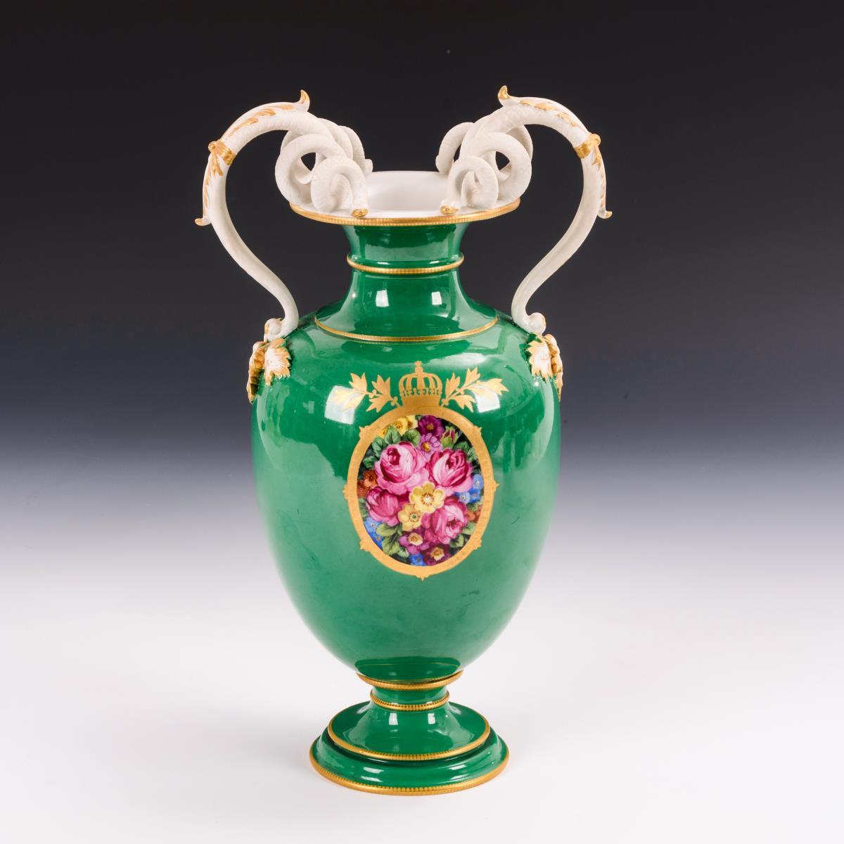 Balustervase mit Biskuit-Schlangenhenkeln. Grüner Fond, schauseitig in einem goldradierten Rahmen ein Blumenbukett. 1 Blattspitze an 1 Henkel restauriert.