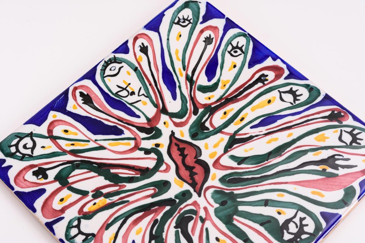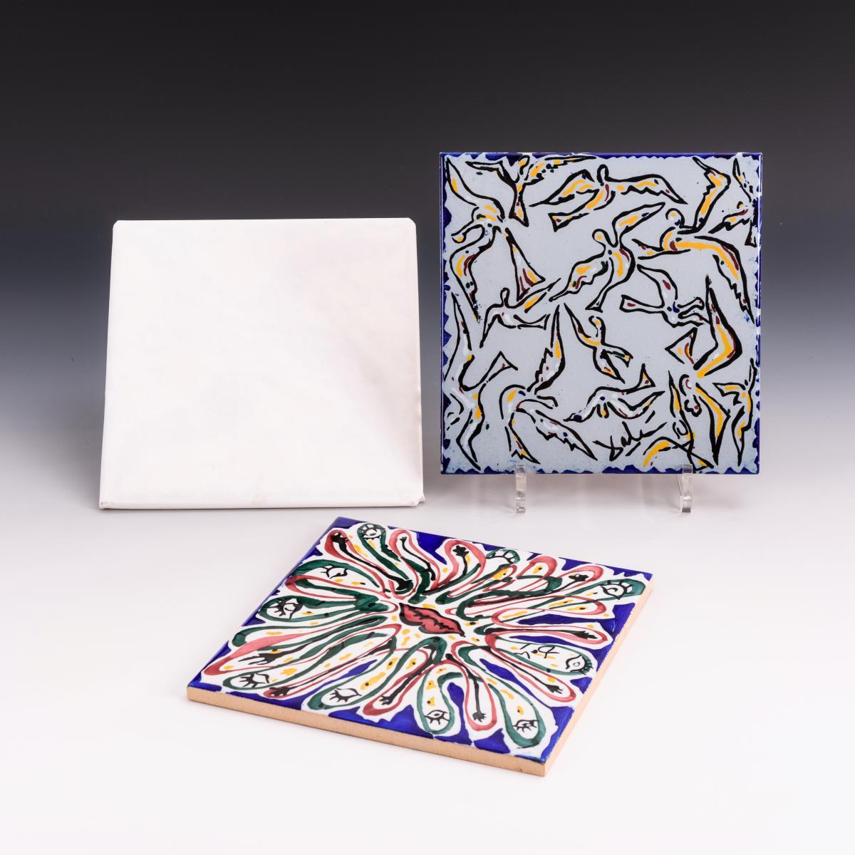 Weiß glasierte, fantasievoll farbig bemalte Fliesen in Anlehnung an die maurische Tradition Spaniens, mit eingebrannter Signatur des Künstlers. "L'étoile de mer" (Seestern), "Le baiser de feu" (Frauen Kataloniens), "Les colombes" (Vögel). Teils in originalem Seidenpapiereinschlag.