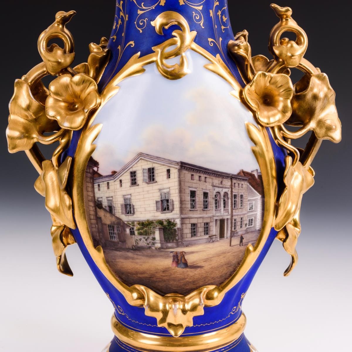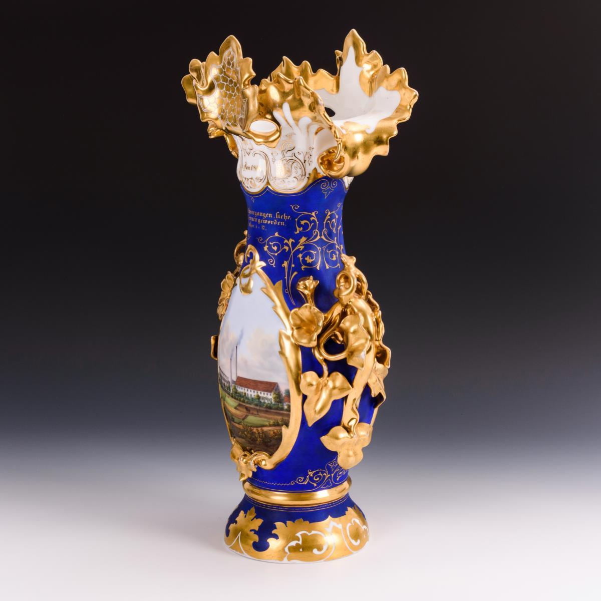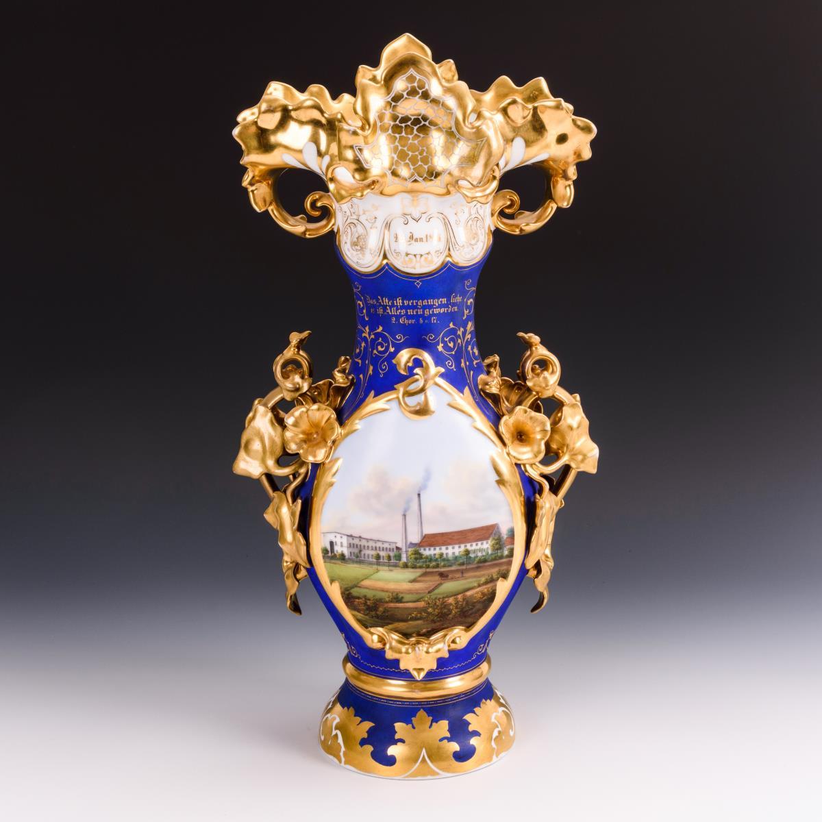 Schlanke Vase mit plastisch gestalteten Floralhenkeln und floralem Mündungsrand. Beidseitig eine große Ovalkartusche mit fein gemalten Architekturansichten: 1x die Ansicht eines Wohnhauses und 1x die Ansicht von Fabrikgebäuden. Verso bezeichnet "2ten Jan 1816." und "Das Alte ist vergangen, siehe, es ist Alles neu geworden. 2. Chor. 5 v. 17.". Minimaler Goldabrieb, Restaurierungen an beiden Handhaben.