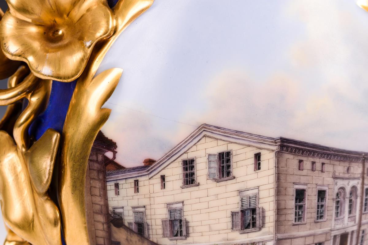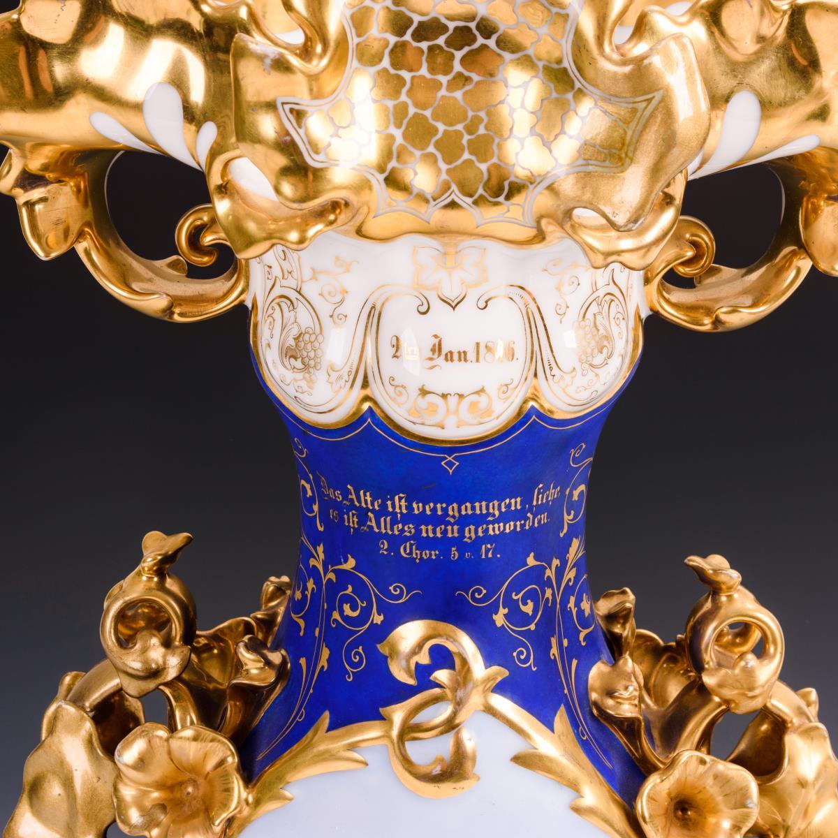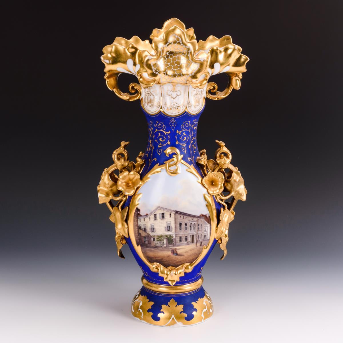 Schlanke Vase mit plastisch gestalteten Floralhenkeln und floralem Mündungsrand. Beidseitig eine große Ovalkartusche mit fein gemalten Architekturansichten: 1x die Ansicht eines Wohnhauses und 1x die Ansicht von Fabrikgebäuden. Verso bezeichnet "2ten Jan 1816." und "Das Alte ist vergangen, siehe, es ist Alles neu geworden. 2. Chor. 5 v. 17.". Minimaler Goldabrieb, Restaurierungen an beiden Handhaben.