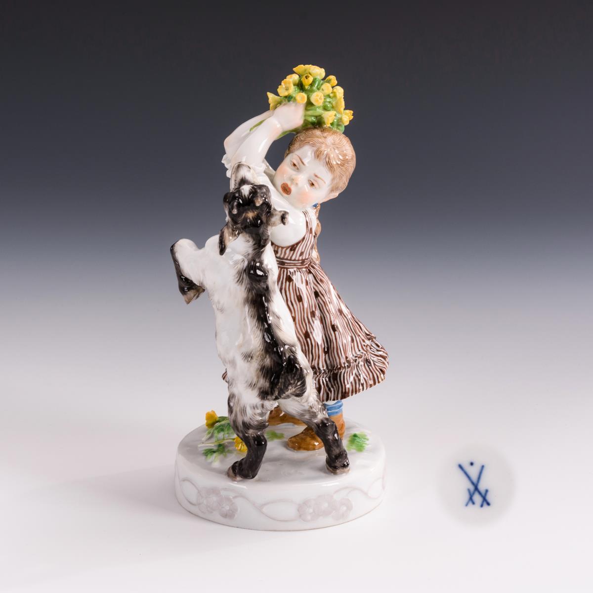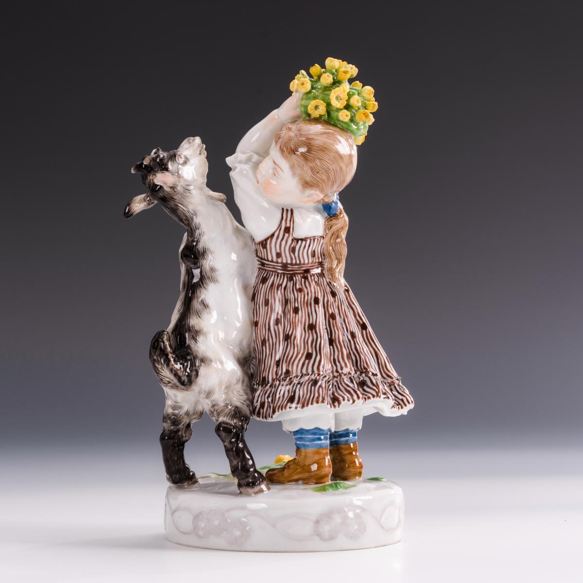 Einen Strauß Schlüsselblumen vor einem gierigen Ziegenbock rettendes Mädchen. Ziegenschwänzchen, Ziegenhorn sowie einige Primeln restauriert.