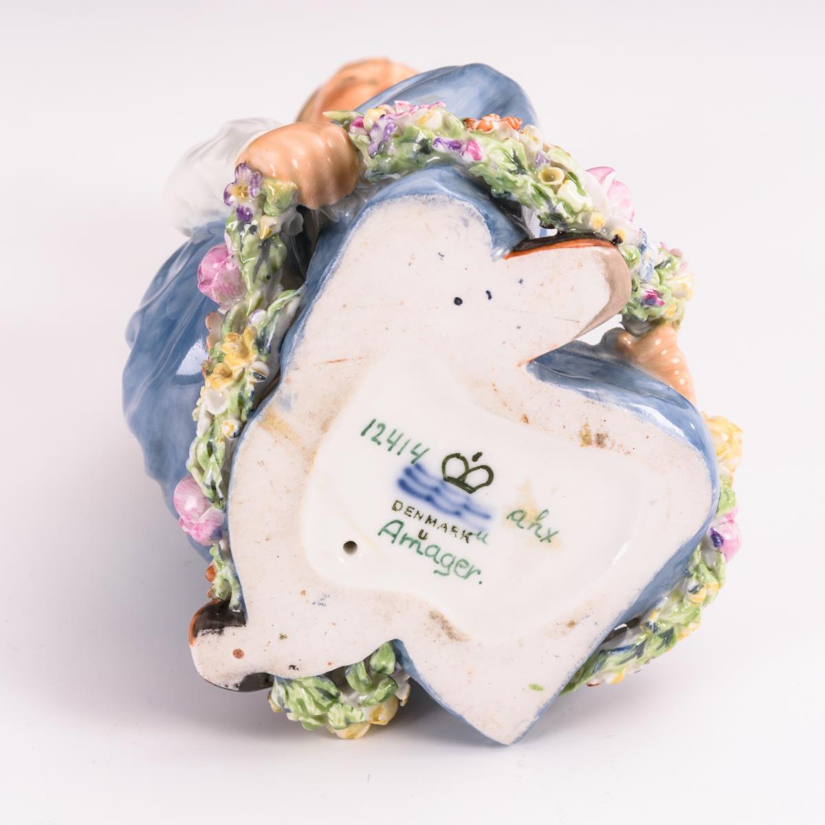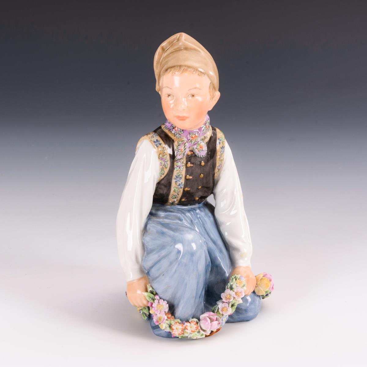 Kniender Knabe in Amager Tracht mit Blütengirlande. Hals restauriert.