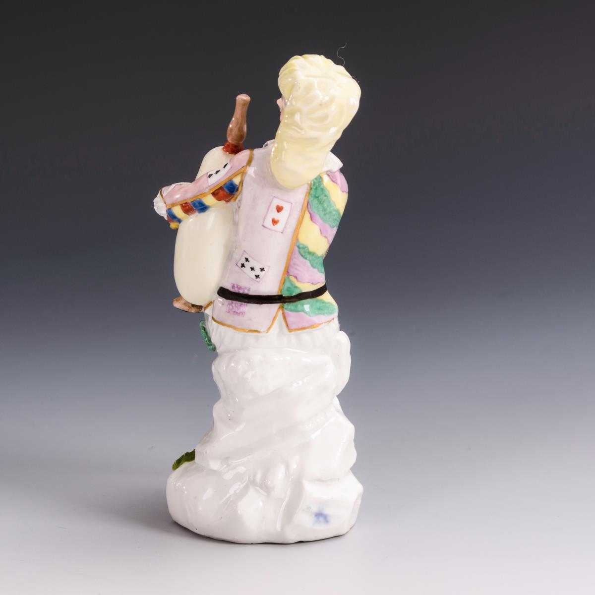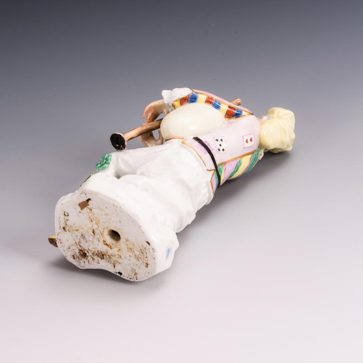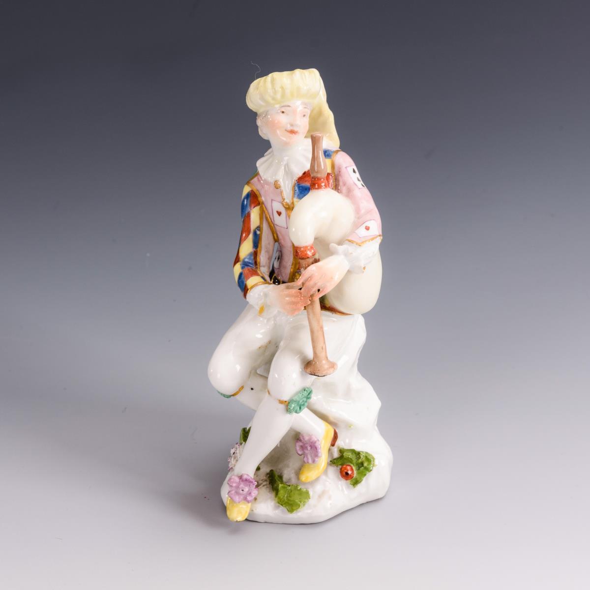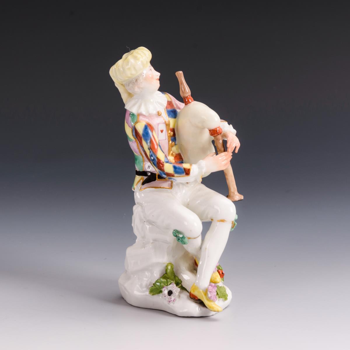 Auf einem Steinsockel sitzender, einen Dudelsack spielender Harlekin. Kopf und Hals, beide Hände sowie Mundstück des Dudelsacks restauriert.
