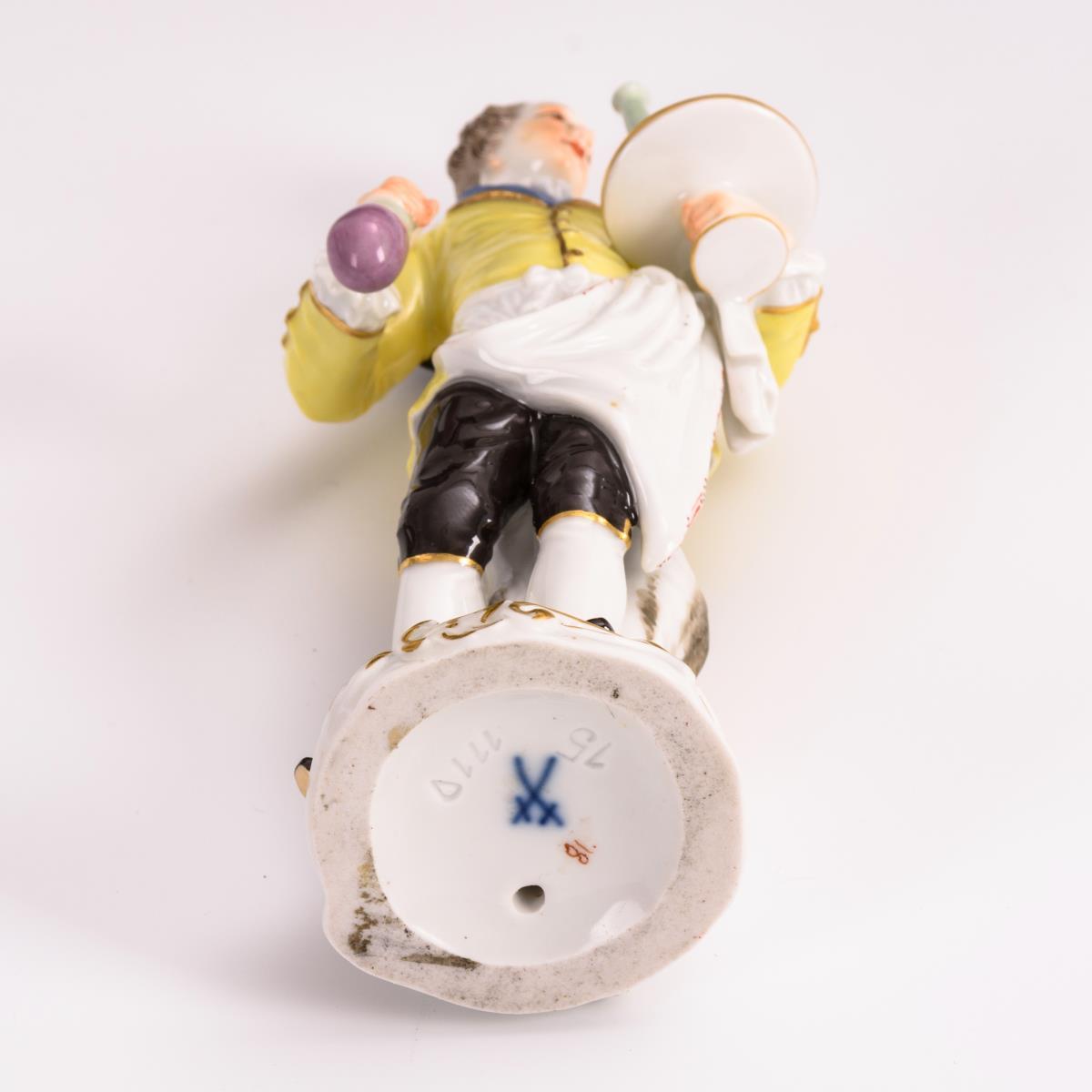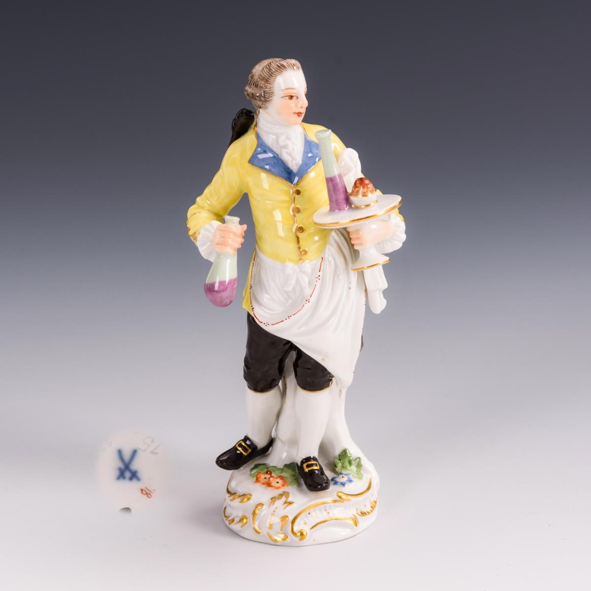 Herr mit Flaschen und Tafelaufsatz als Tablett. Haarbeutel restauriert.