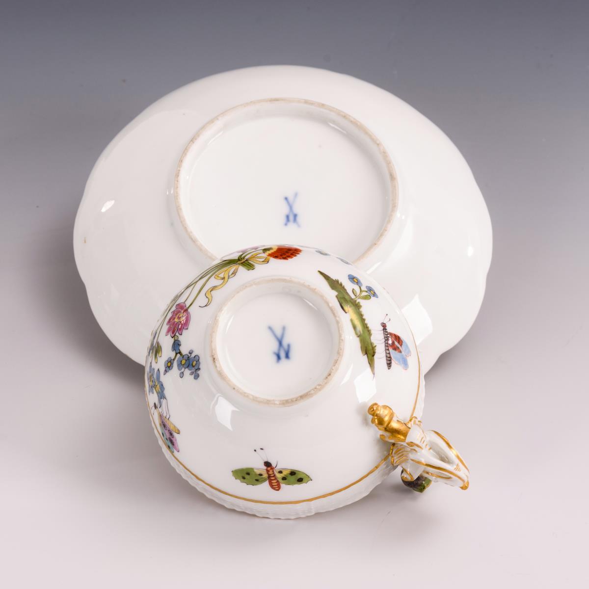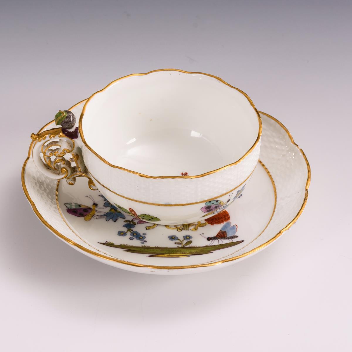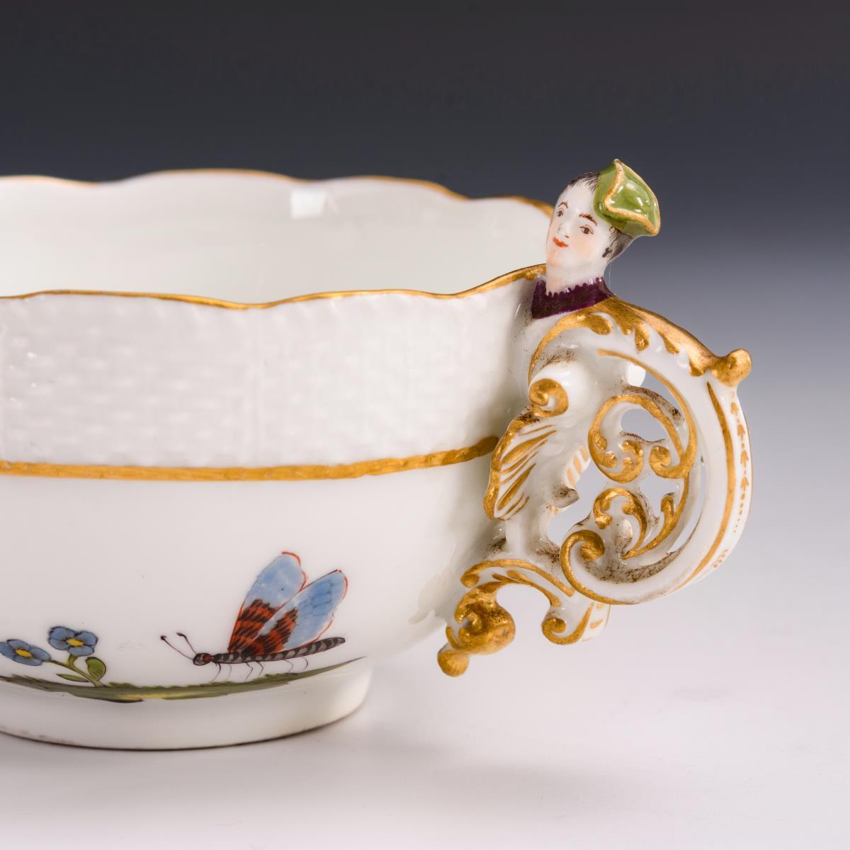 Polychrom bemalt, goldstaffiert. H Tasse 6 cm, Ø Untertasse 13,5 cm.