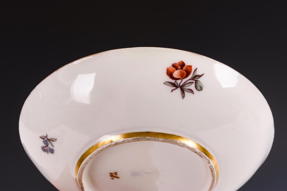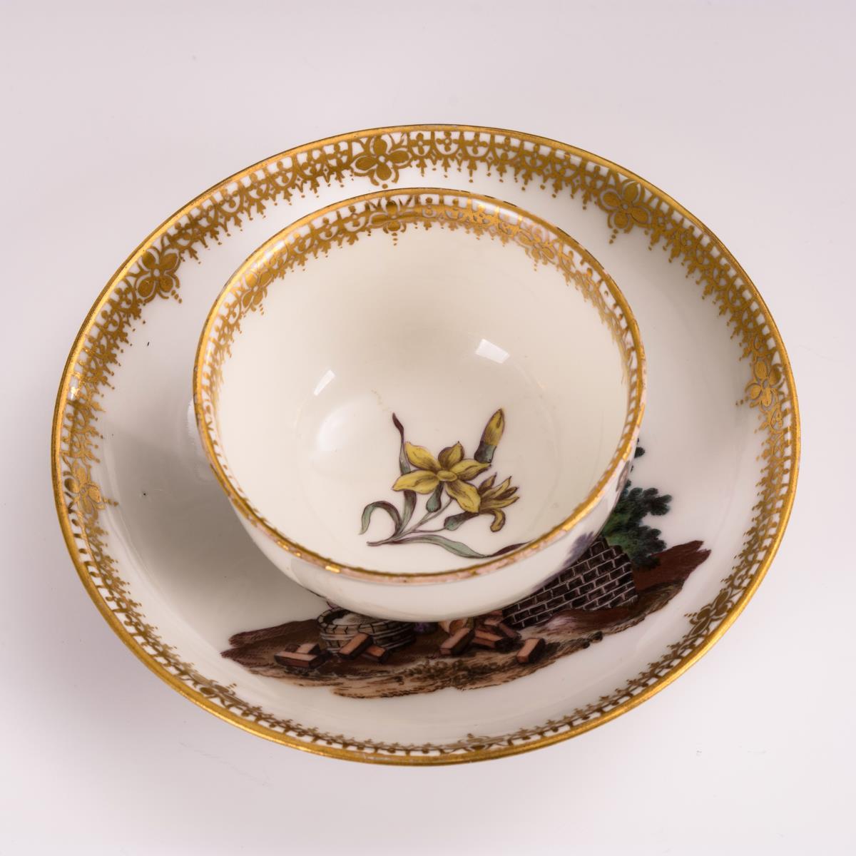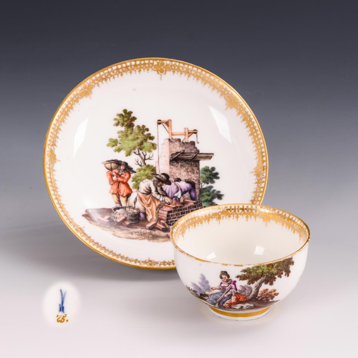 Beidseitig auf dem Koppchen eine Jagdszene, im Spiegel der Untertasse die Darstellung von Bauarbeitern beim Turmbau. Minimaler Goldabrieb am Mündungsrand des Koppchens, unterseitige Restaurierung am Untertassenrand (siehe Zusatzfoto).