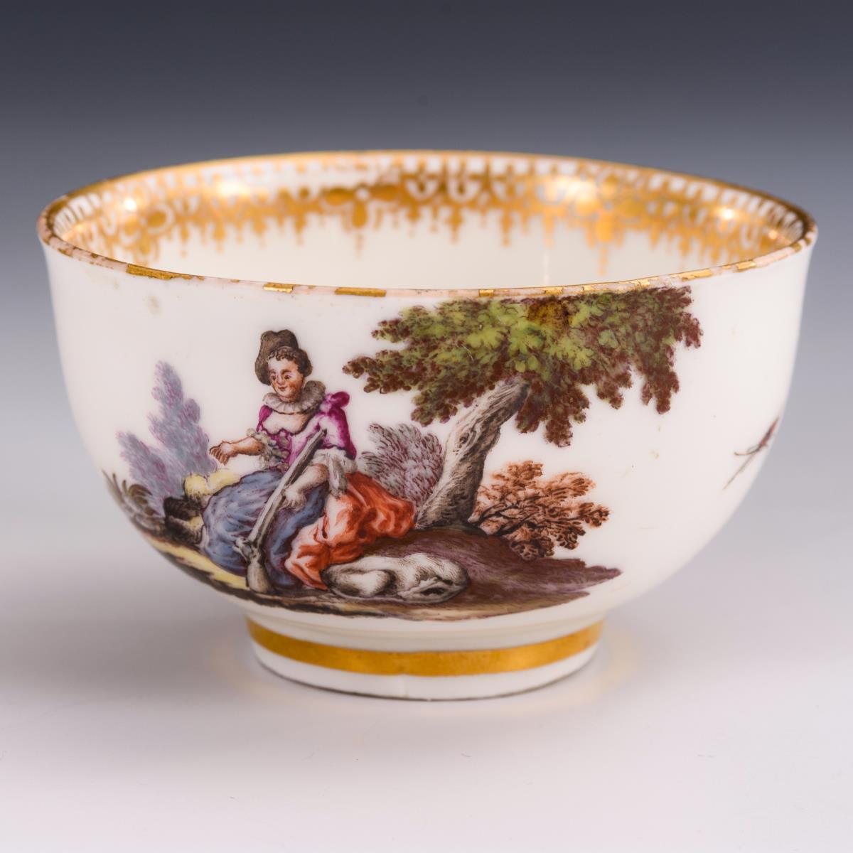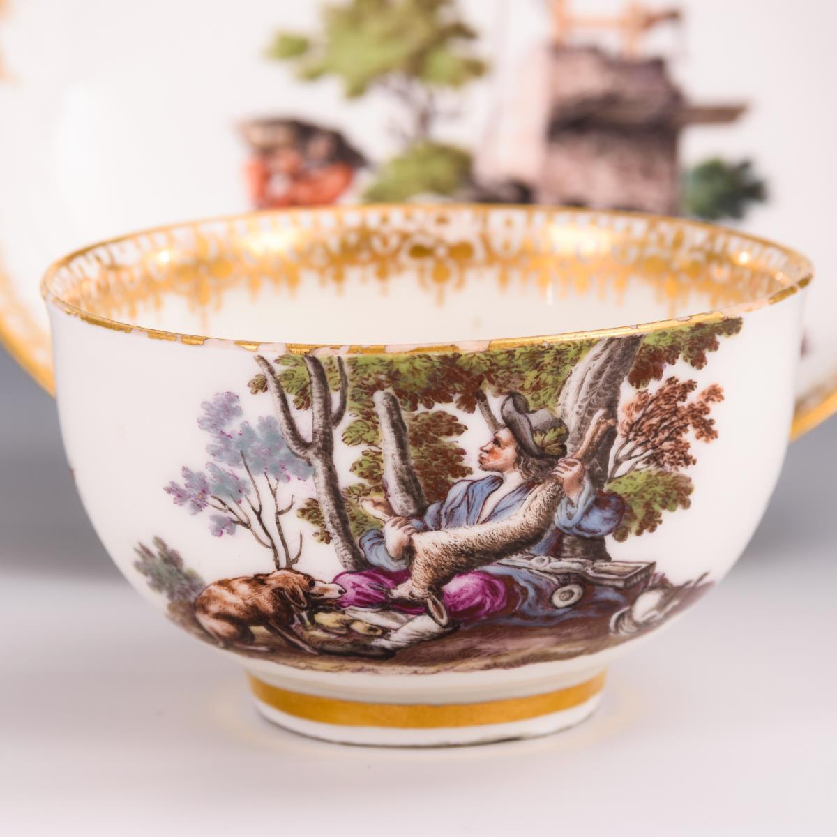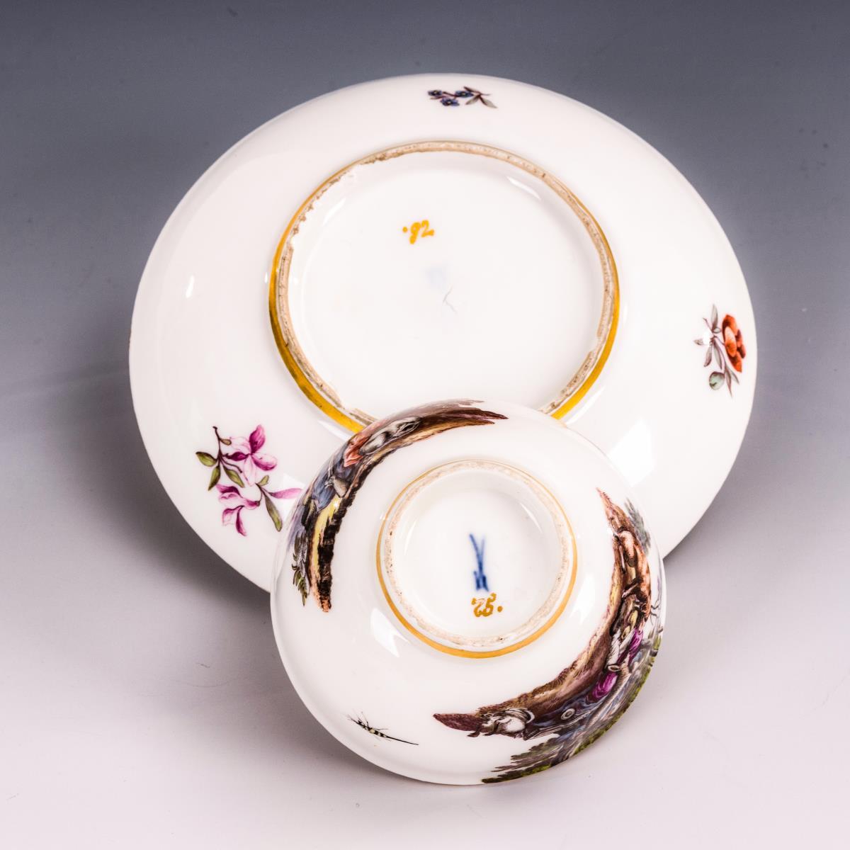 Tasse und Untertasse mit Jagdmotiv und Baumotiv. Meissen.