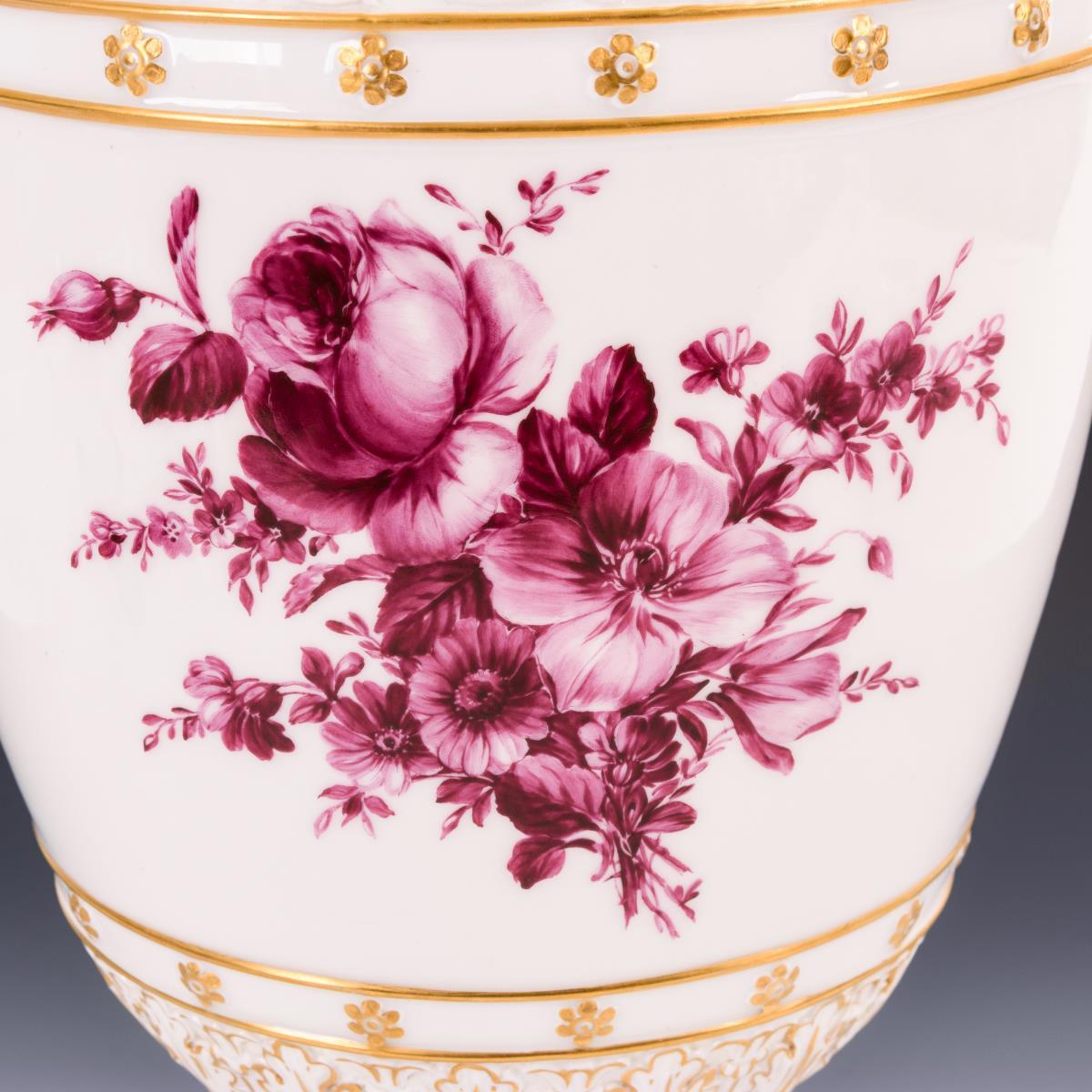Ovoider Korpus mit vegetabil reliefierter Biskuitschulter, zwei Akanthusblatthenkeln, Rundfuß und Quadratplinthe. Beidseitig ein Blumenbukett.