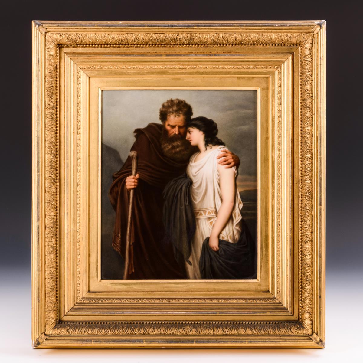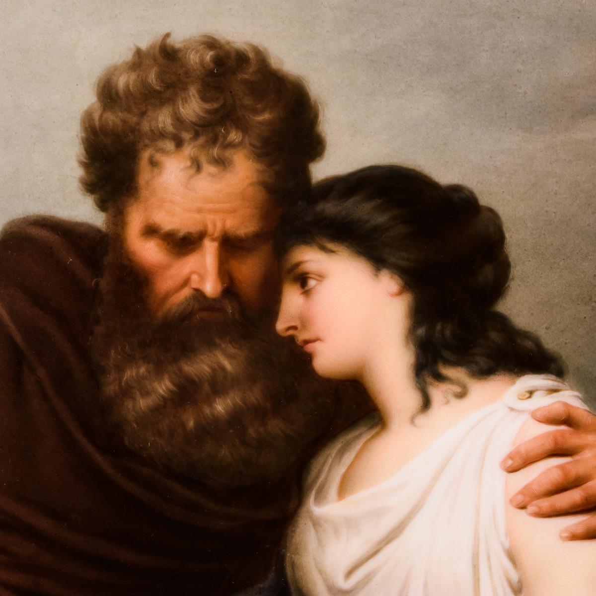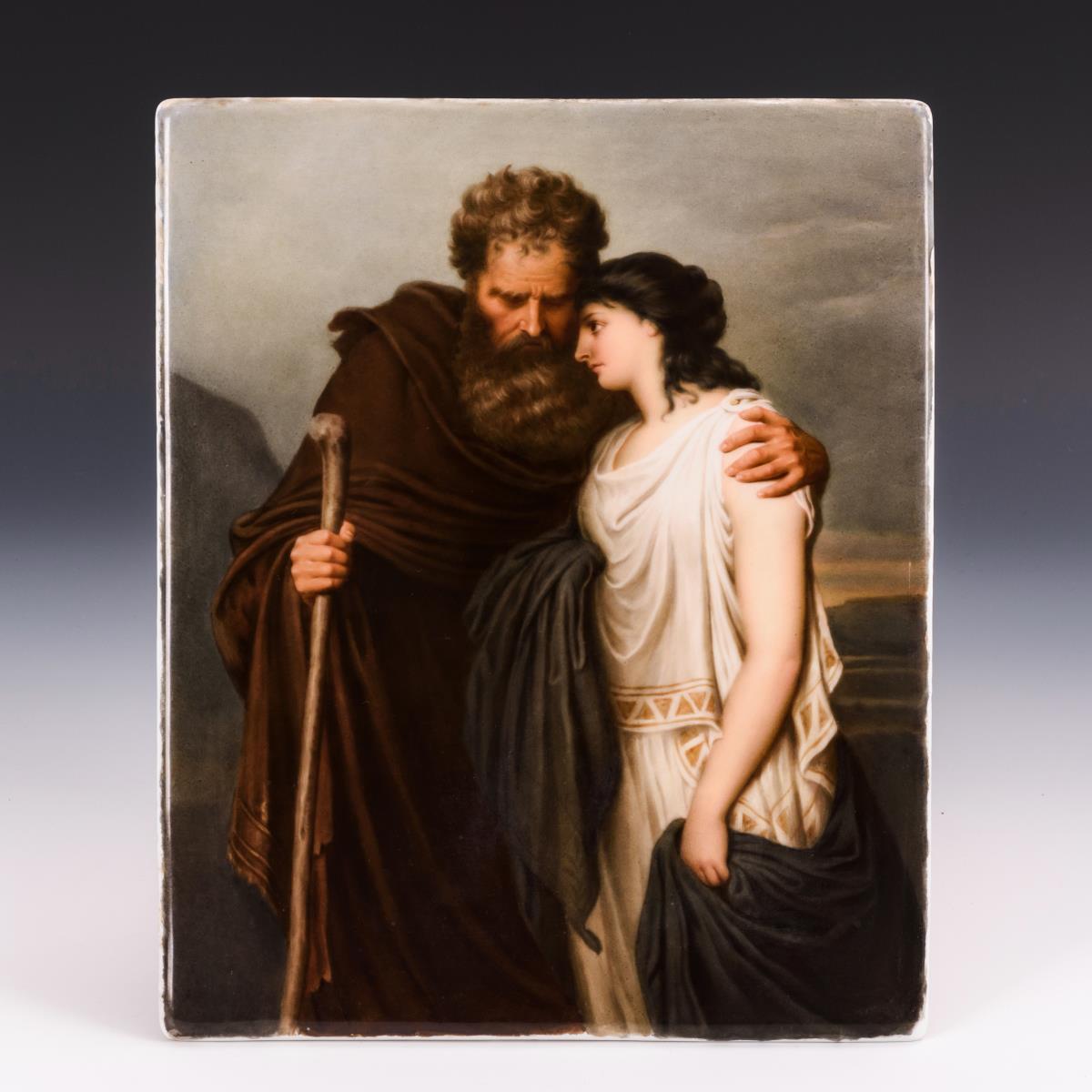 Rechteckige Platte mit der Darstellung der ihren Vater Ödipus führenden Antigone.