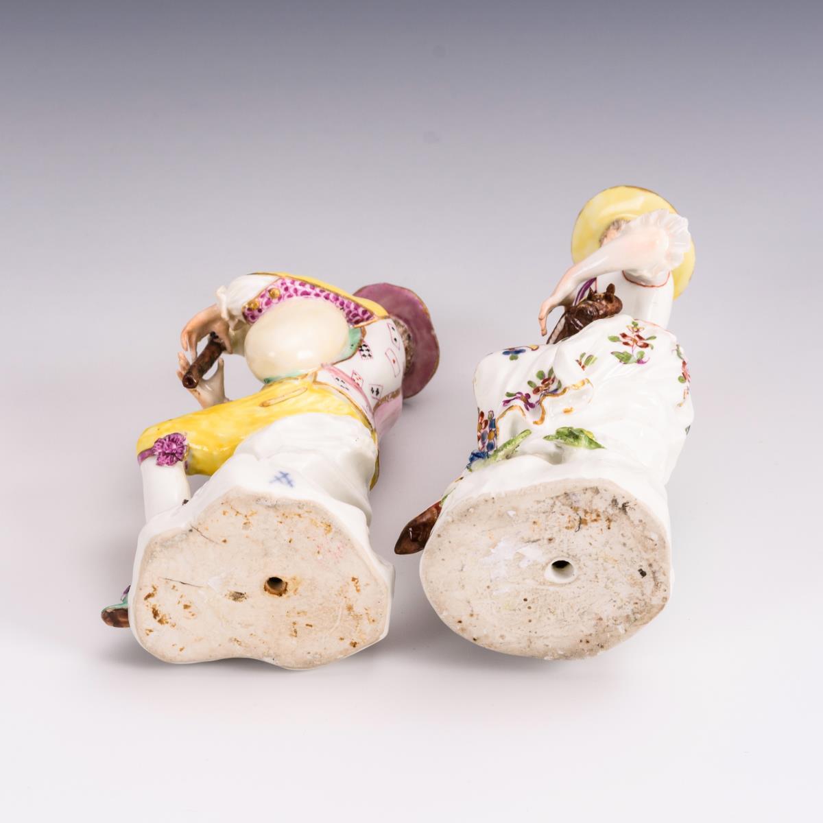 Schuhspitze, Wirbel der Drehleier und rechte Hand des Mädchens sowie Dudelsackpfeife und zwei Finger des Herren restauriert, je 1 Finger bestoßen, minimale Bestoßung am Hutsaum des Herren, partiell minimaler Goldabrieb.