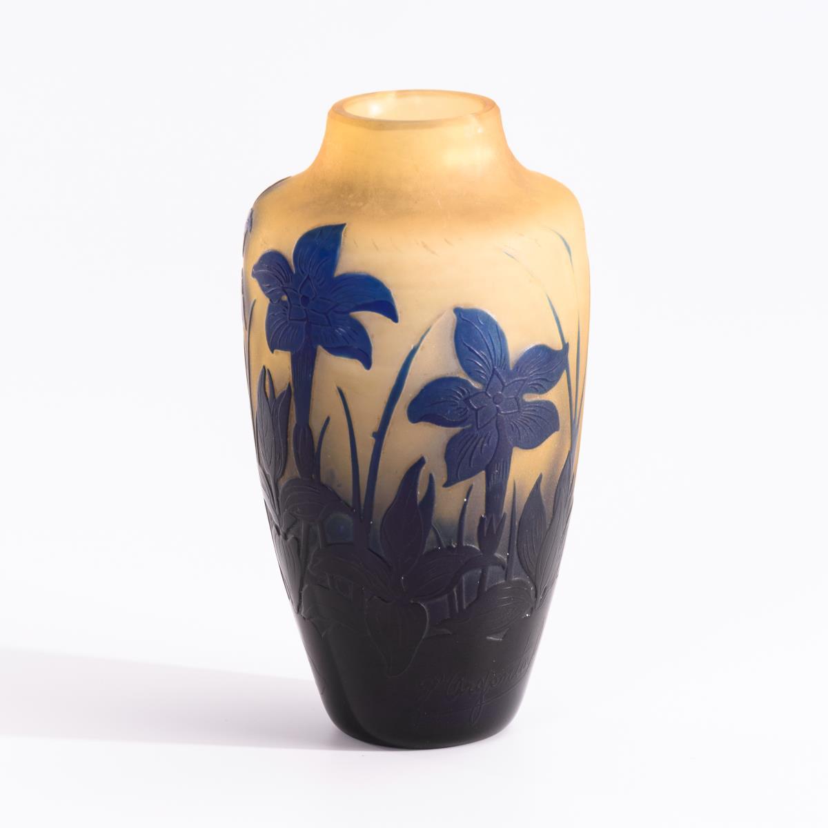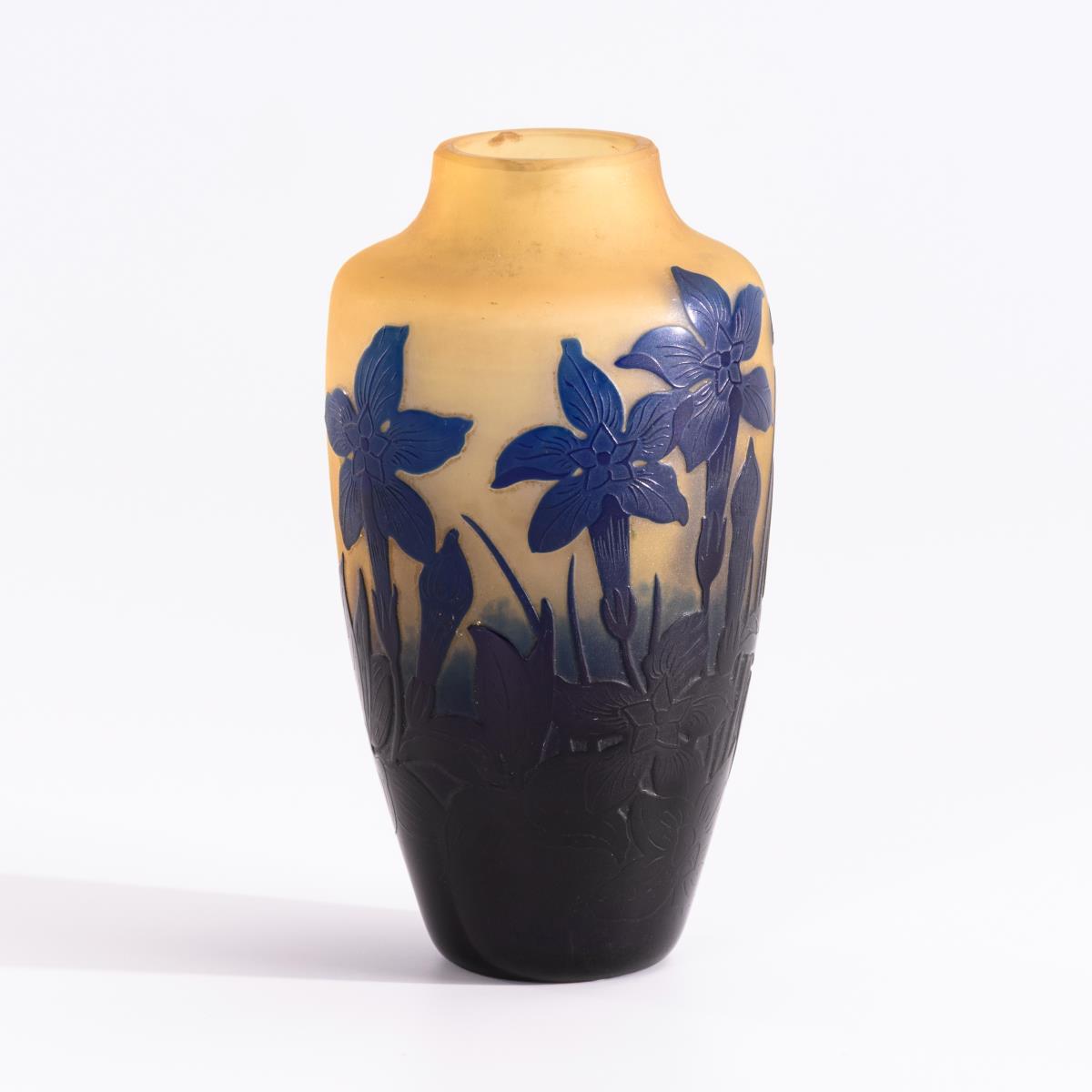 Farbloses, gelblich unterfangenes und kobaltblau überfangenes Glas, mattiert. H 11 cm.
