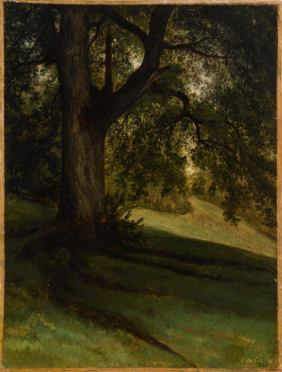 Wiesenhang am Waldrand mit großem, Schatten spendendem Baum. Minimale Altersspuren.