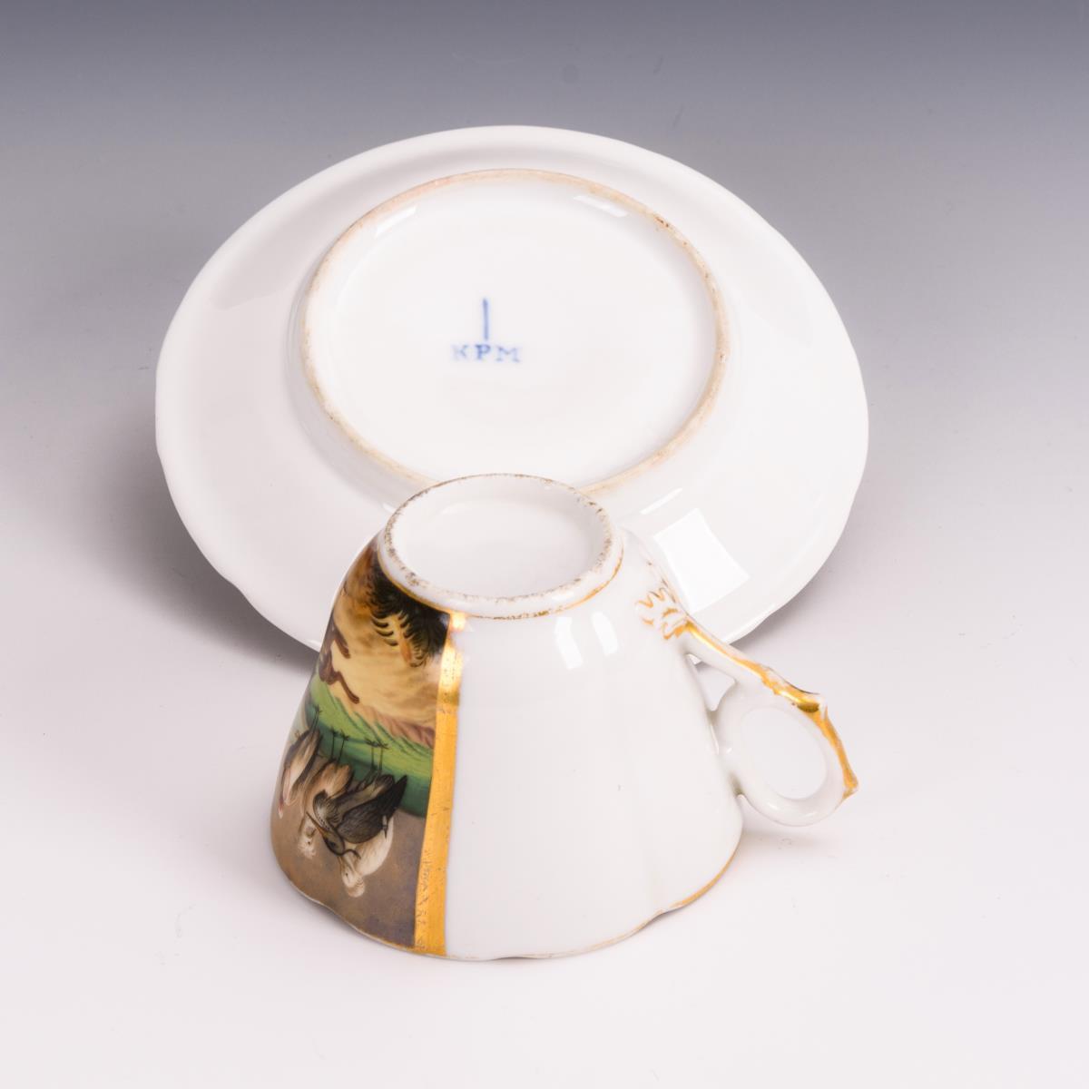 Polychrom bemalt, goldstaffiert. H Tasse 6,5 cm, Ø ergänzte Untertasse 14,5 cm.
