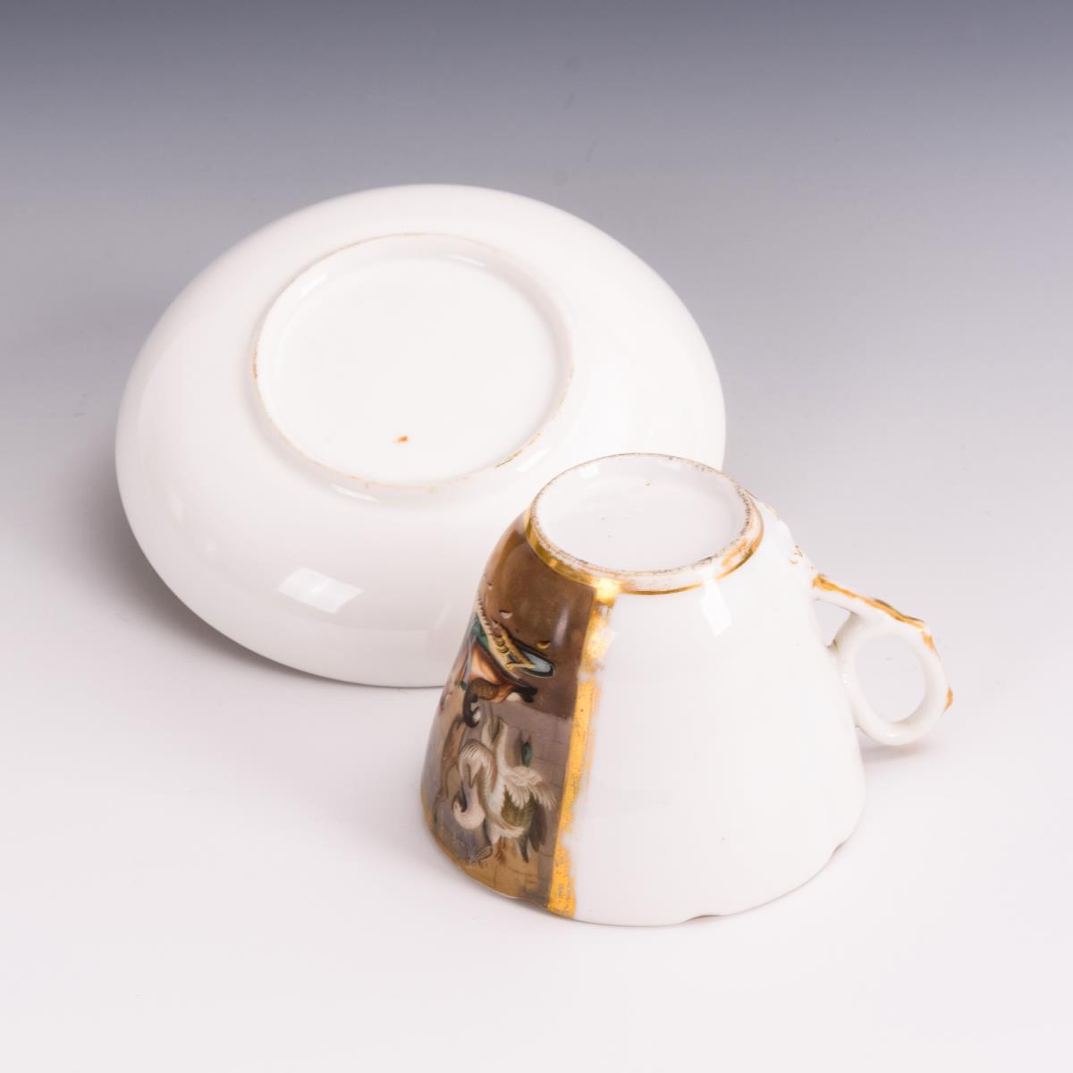 Polychrom bemalt, goldstaffiert. H Tasse 6,5 cm, Ø ergänzte Untertasse 12,5 cm.