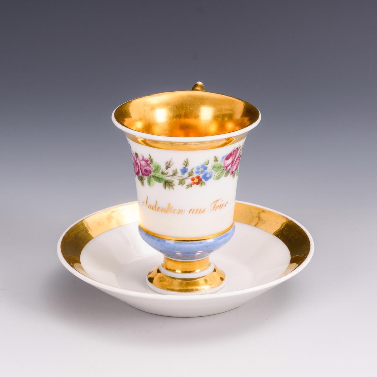 Gefußte Kratertasse mit Löwenkopfhenkel. Umlaufend ein Blütenband, schauseitig die Aufschrift "Andenken an Trier", innen vergoldet.