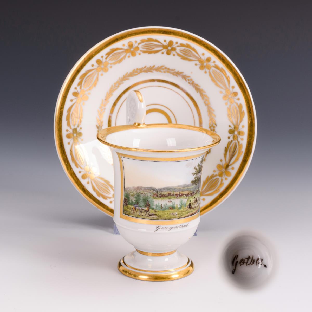 Gefußte Kratertasse mit Löwenkopfhenkel. Schauseitig eine Rechteckkartusche mit der bezeichneten Ansicht des Ortes Georgenthal im Thüringer Wald.