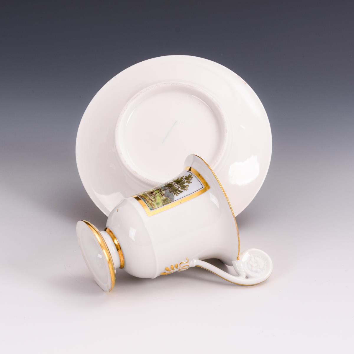 Polychrom bemalt, goldstaffiert. H Tasse 11 cm, Ø ergänzte Untertasse 14,5 cm.