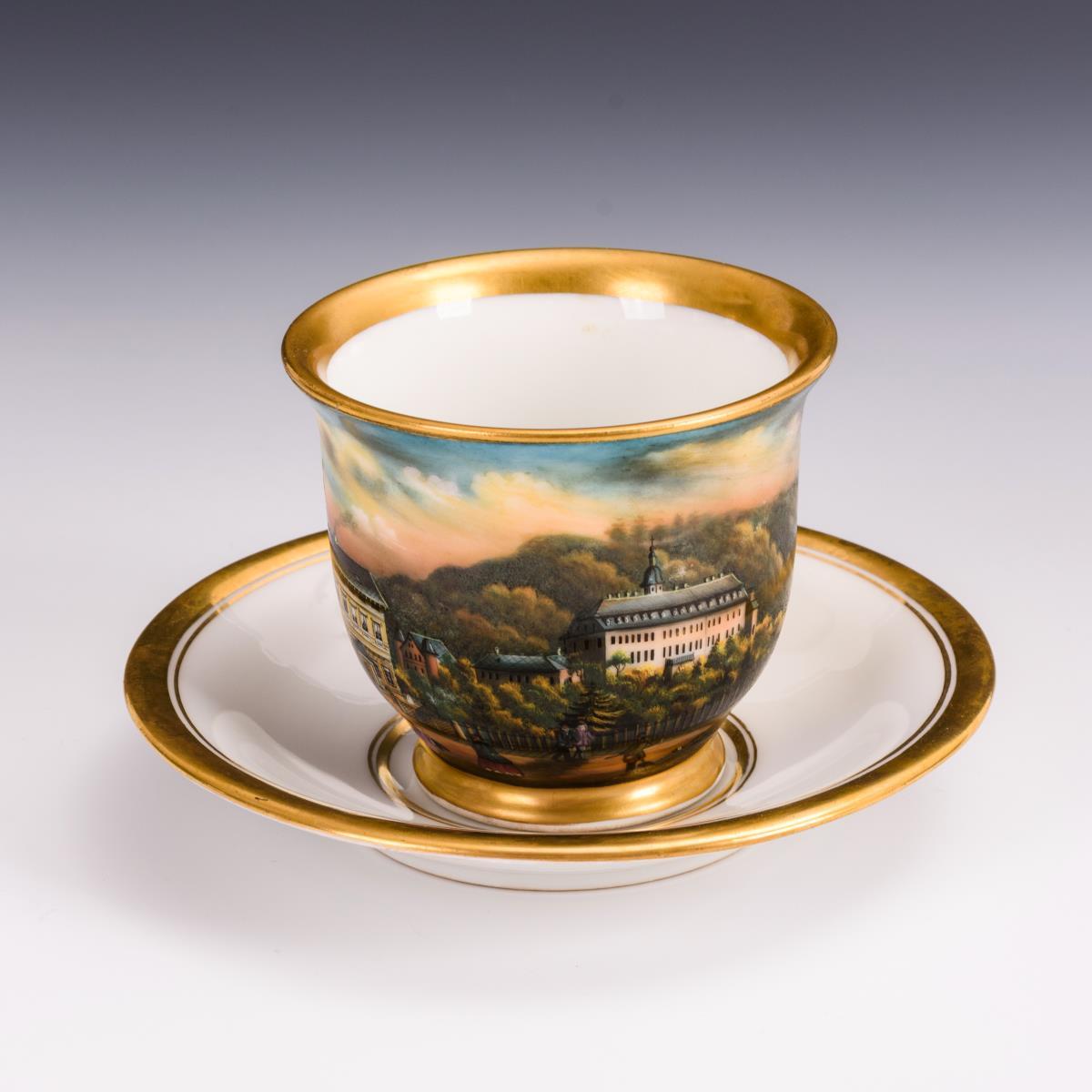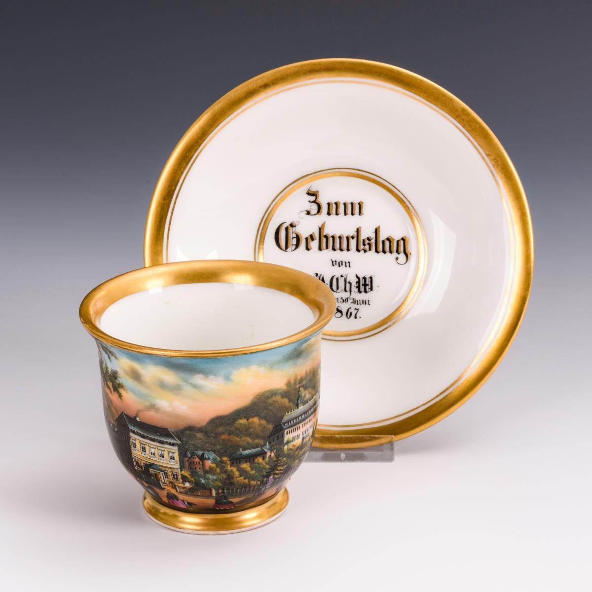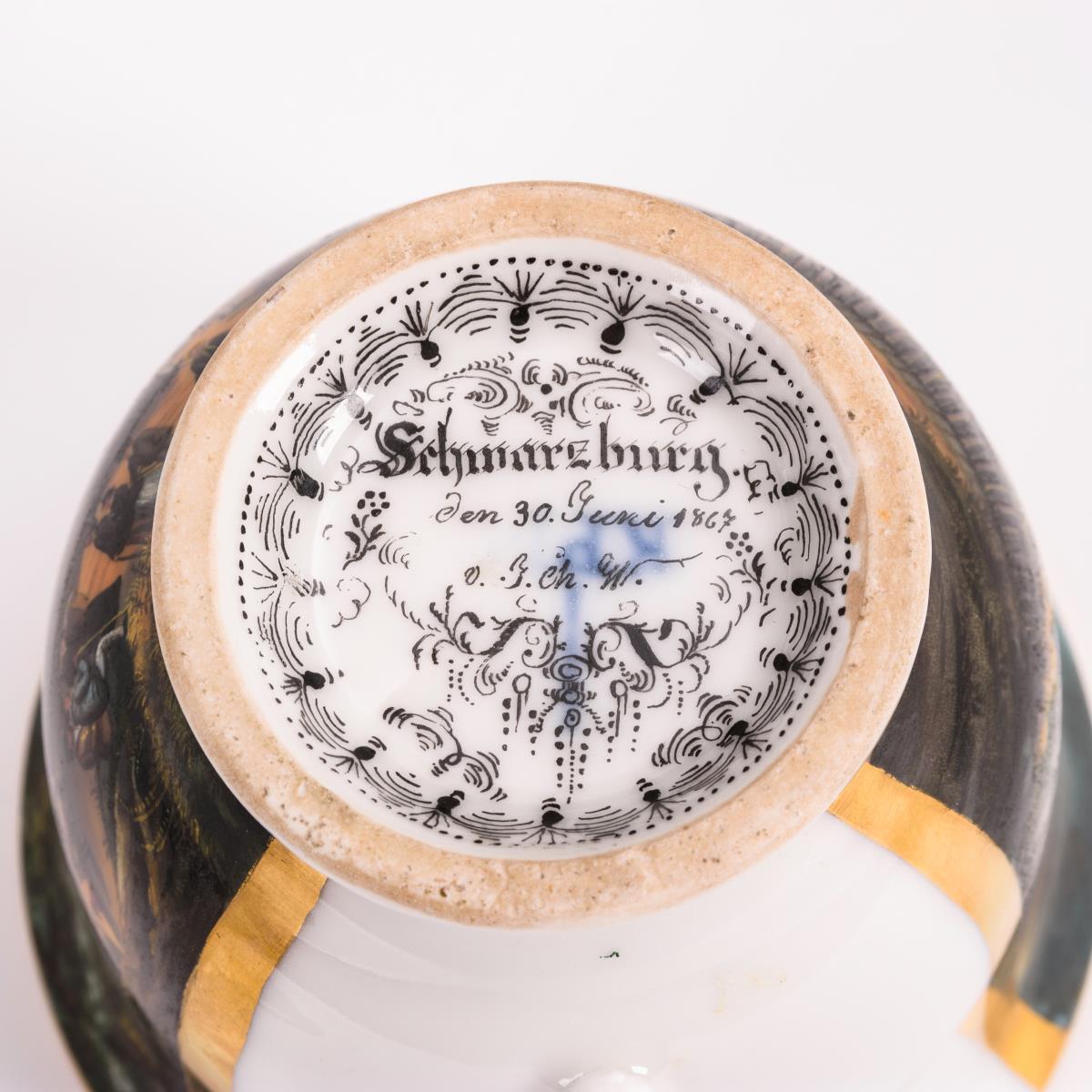 Glockentasse mit Ohrenhenkel. Schauseitig eine Rechteckkartusche mit der Ansicht der sich über dem Schwarzatal erhebenden Schwarzburg sowie des historischen, vor der Schwarzburg gelegenen Hotels "Weißer Hirsch". Unterseitig schwarze Ornamentmalerei sowie die Bezeichnung "Schwarzburg den 30. Juni 1867 v. J. Ch. W.", im Spiegel der Untertasse die Bezeichnung "Zum Geburtstag von J. C. W. den 30. Juni 1867".