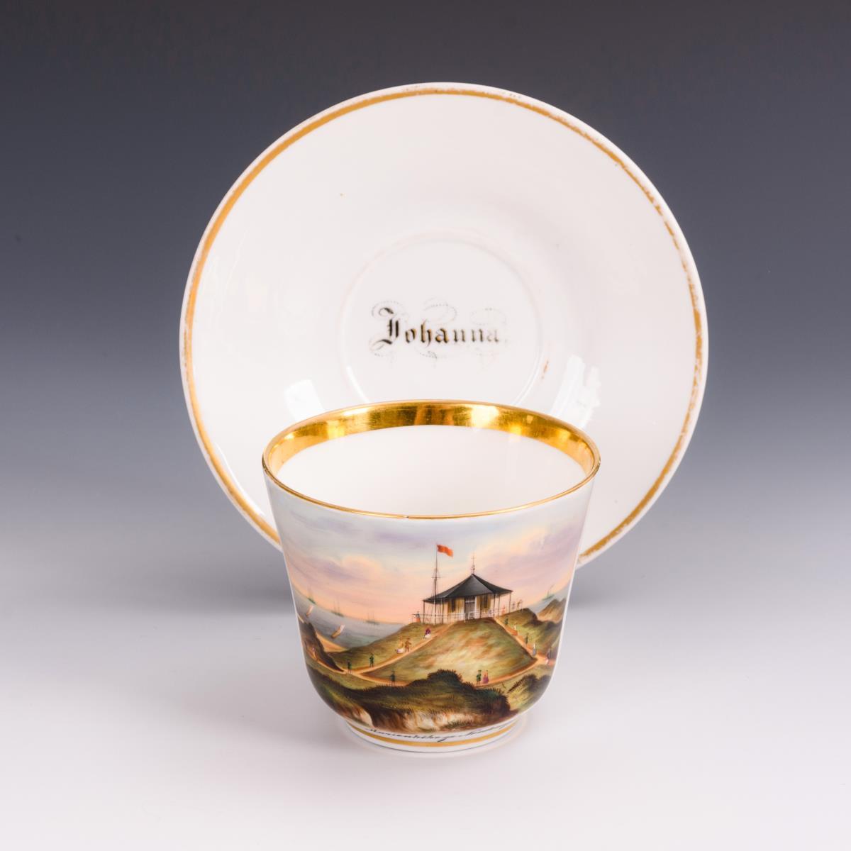 Konische Tasse mit Rocaillehenkel. Schauseitig die bezeichnete Ansicht des Panoramacafes auf der Insel Norderney. Kurzer Haarriss unterhalb des Tassenhenkels, Haarrissspinne in der Untertasse, partieller Goldabrieb.