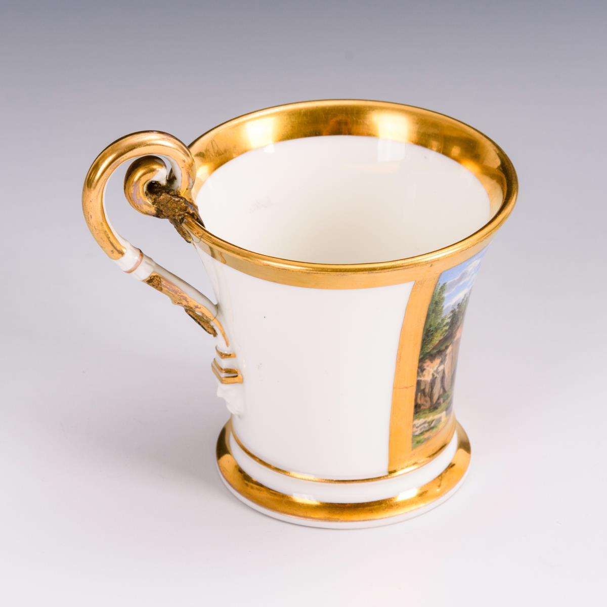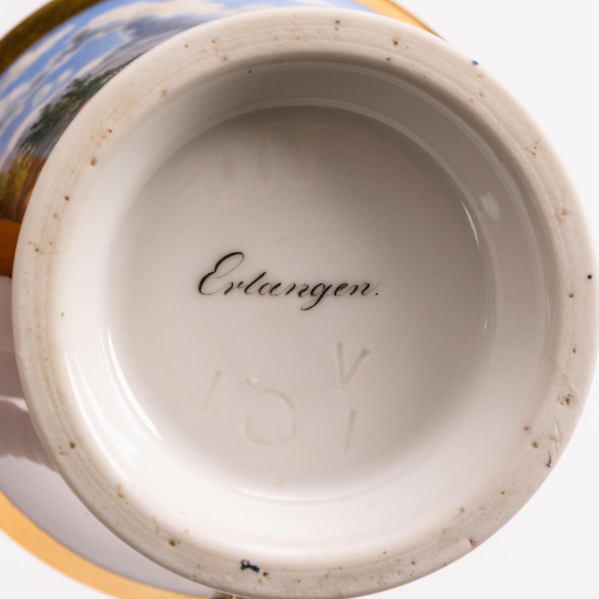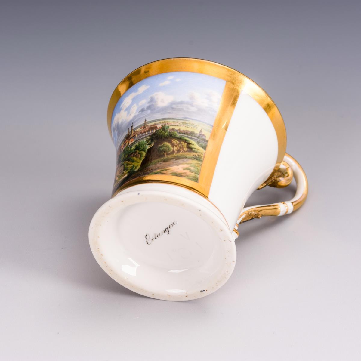 Kratertasse mit Maskaronhenkel. Schauseitig eine Rechteckkartusche mit der unterseitig bezeichneten Vedute von Erlangen. Ohne Untertasse. Henkel restauriert.