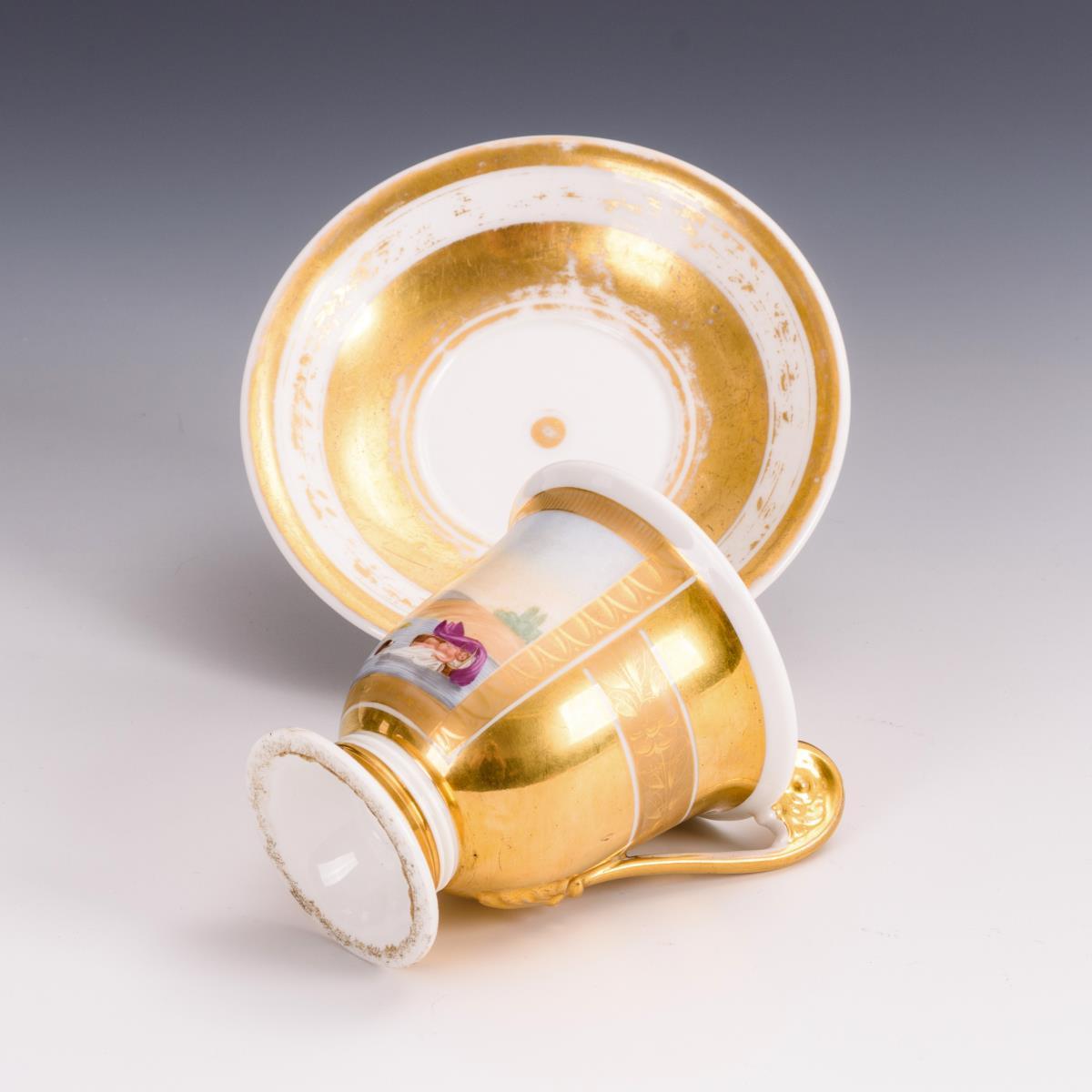 Polychrom bemalt, goldstaffiert. H Tasse 11 cm, Ø ergänzte Untertasse 13 cm.