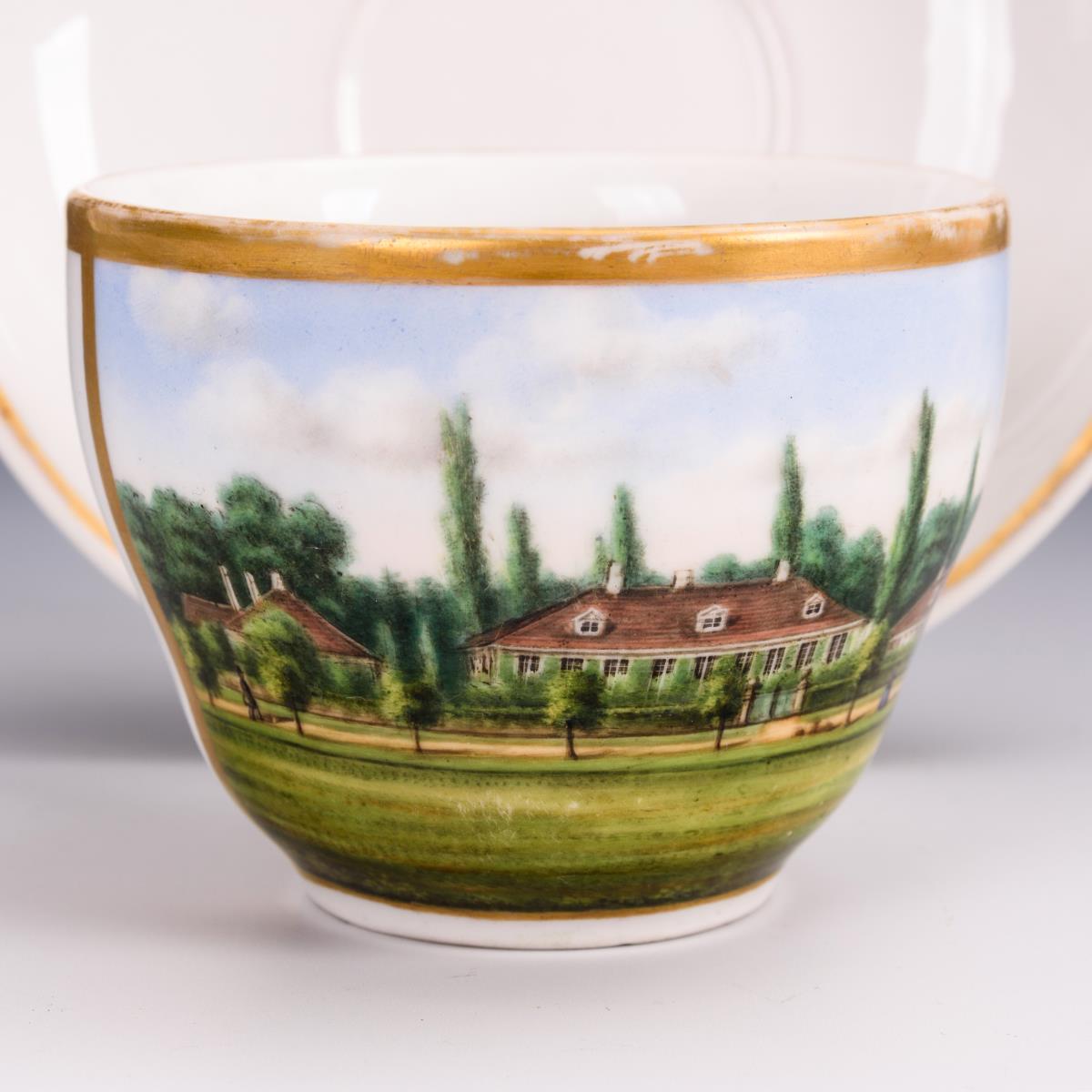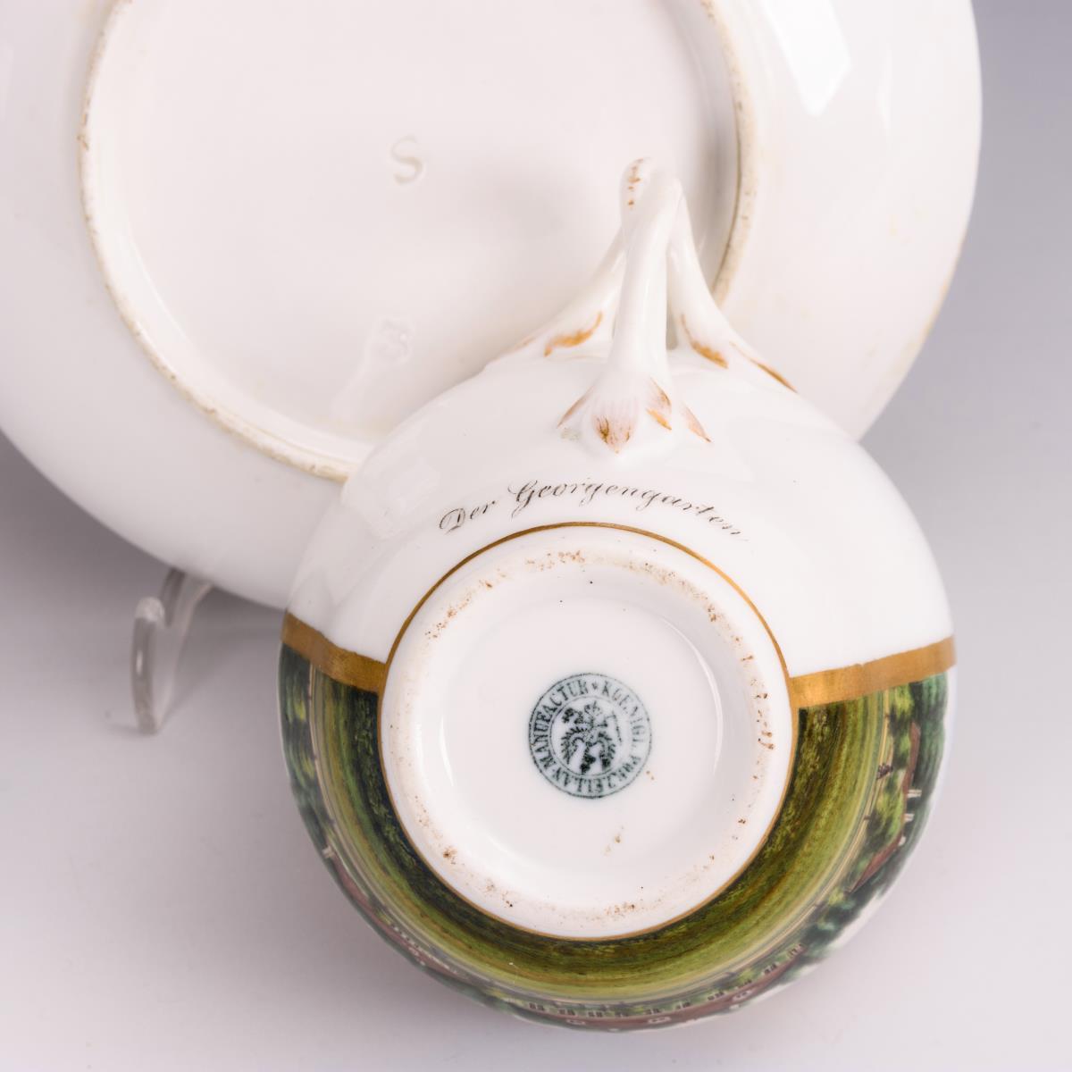 Glockentasse mit gewundenem Asthenkel. Schauseitig eine gerahmte Rechteckkartusche mit der bezeichneten Ansicht des Georgengartens in Dessau. Gold berieben, Henkel restauriert.