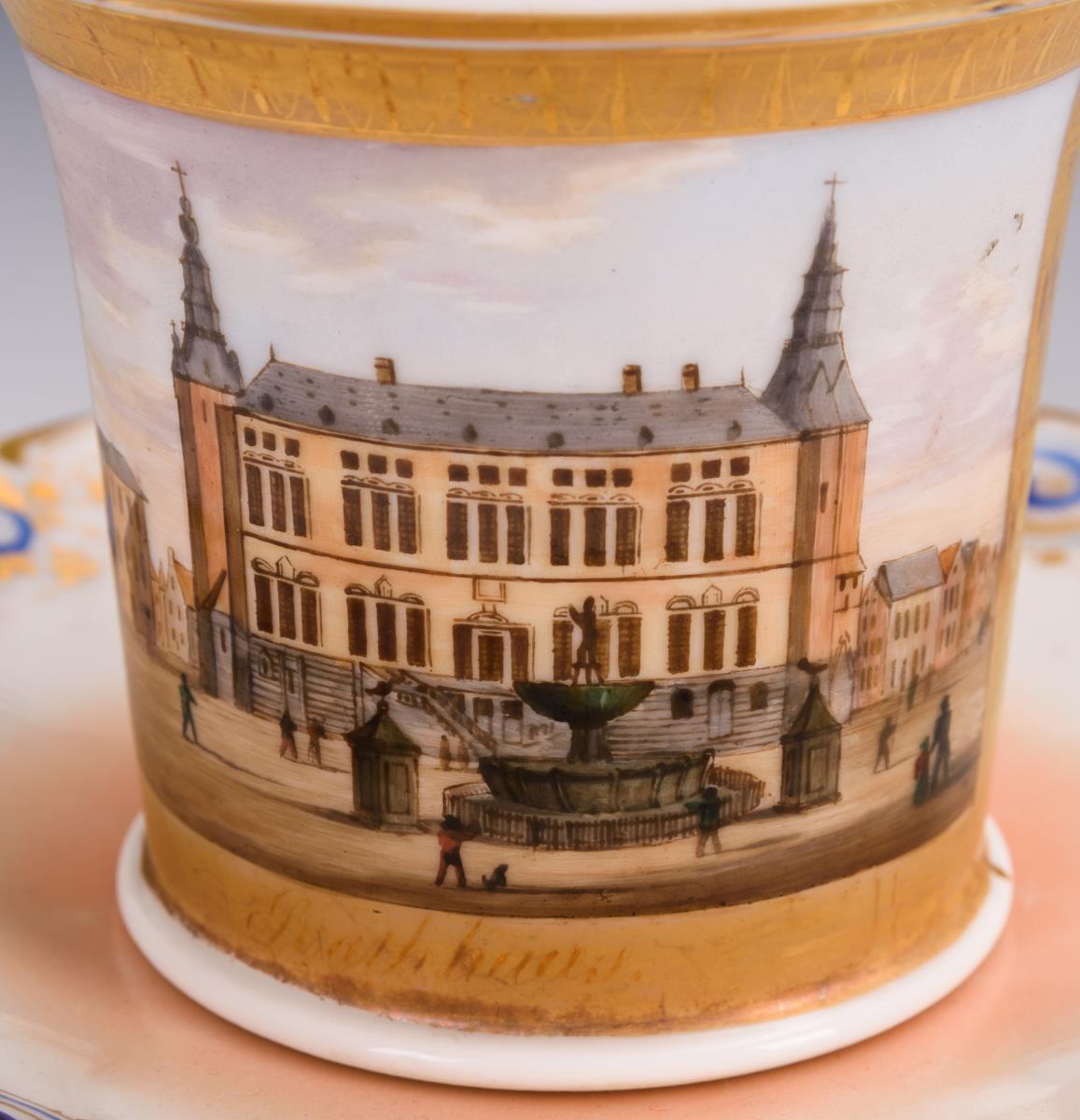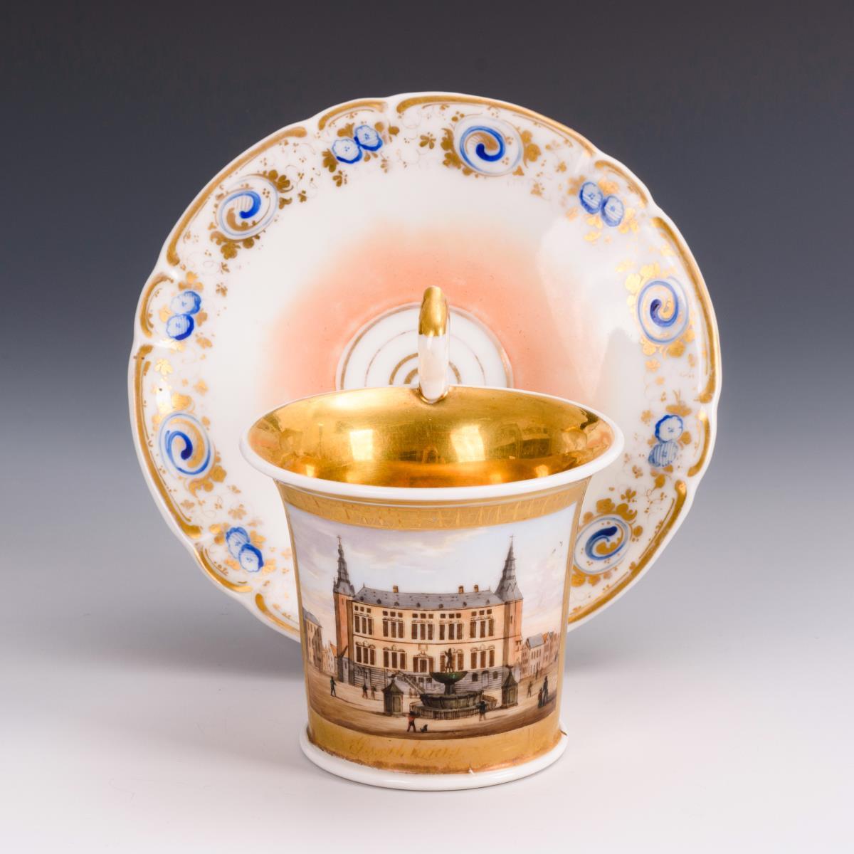 Kratertasse mit Palmettenhenkel. Schauseitig eine Rechteckkartusche mit der bezeichneten Ansicht des Aachener Rathauses mit Karlsbrunnen, verso floral-ornamentale Goldmalerei. Haarrissspinne in der Untertasse.