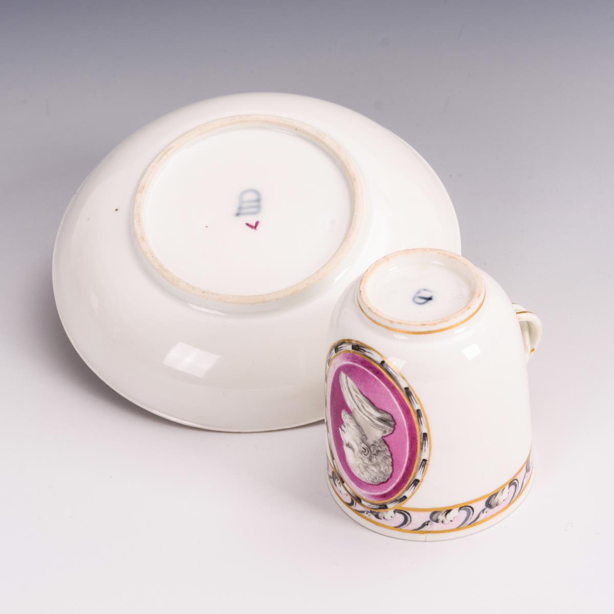 Schauseitig auf der Tasse sowie im Spiegel der Untertasse ein ovales Medaillon mit Purpurfond sowie dem grisaillegemalten Profilbildnis eines antiken Mannes. Partieller Goldabrieb, kleiner Brandriss am Mündungsrand der Tasse.