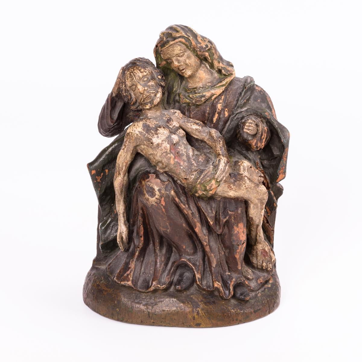 Den toten Christus auf dem Schoß gleichsam präsentierende Mutter Gottes. Anobienspuren, minimale Fehlstellen, Fassung großteils alt übergangen, Alters-/Gebrauchsspuren.