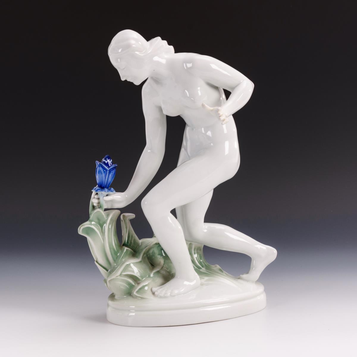 Eine Blume pflückende junge Frau. Linke Hand restauriert.