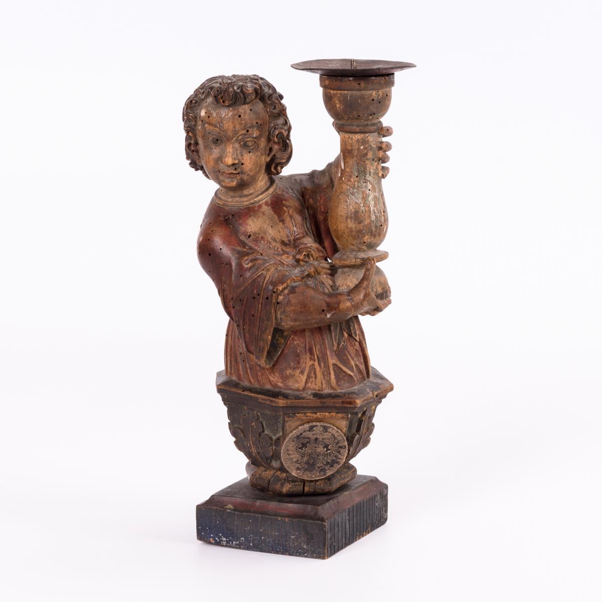 Zusammen mit dem Blattkapitell aus einem Stück geschnitzte Hüftfigur des Engels mit der Geißelsäule (arma Christi) in der Hand. Wohl nachträglich zum Leuchterengel mit Wachsteller und Dorn umgearbeitet sowie aufgeklebter Taler. Trockenrisse zumeist am Kapitell, kleiner Ausbruch ebd., Anobienspuren, wohl jünger gefasst, Plinthe ergänzt, Taler avers abgeschliffen.