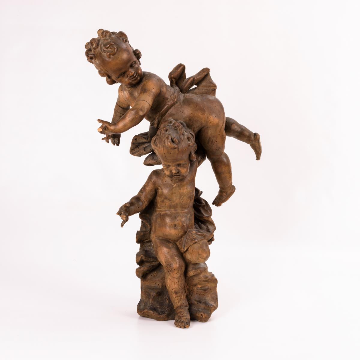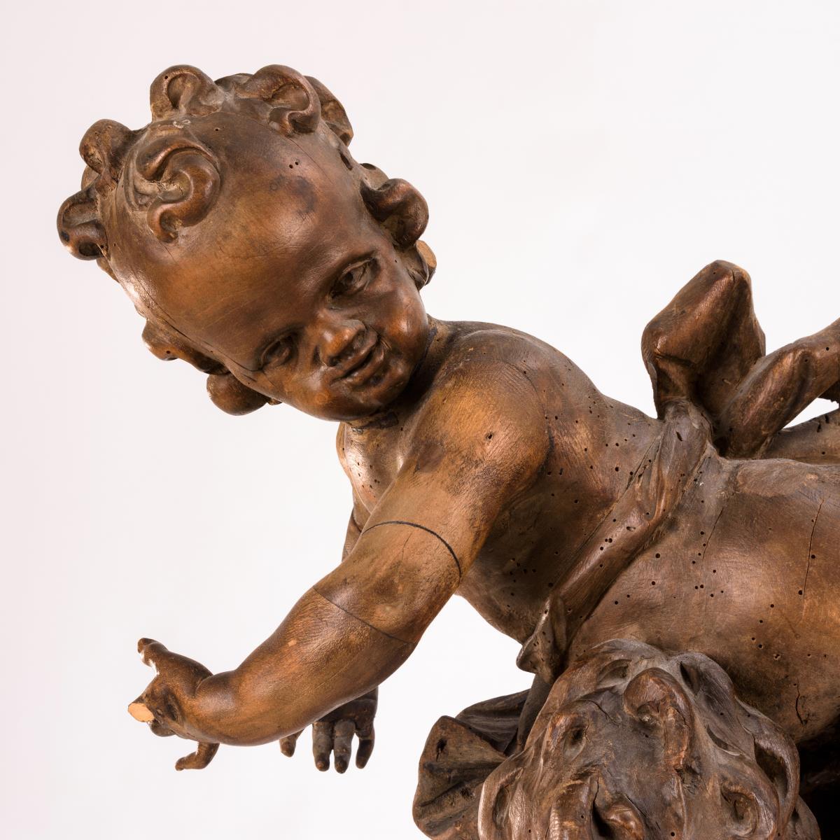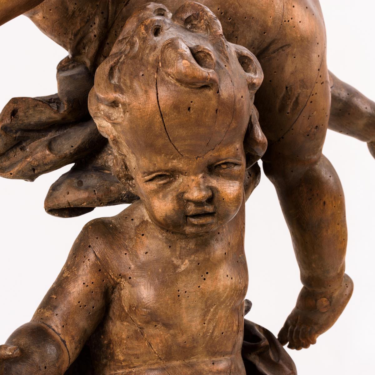Stehender und darüber gleichsam schwebender Putto, je in raumgreifenden Gesten. Trockenrisse, Anobienspuren, 1 Arm fehlt, einige alte Ergänzungen.