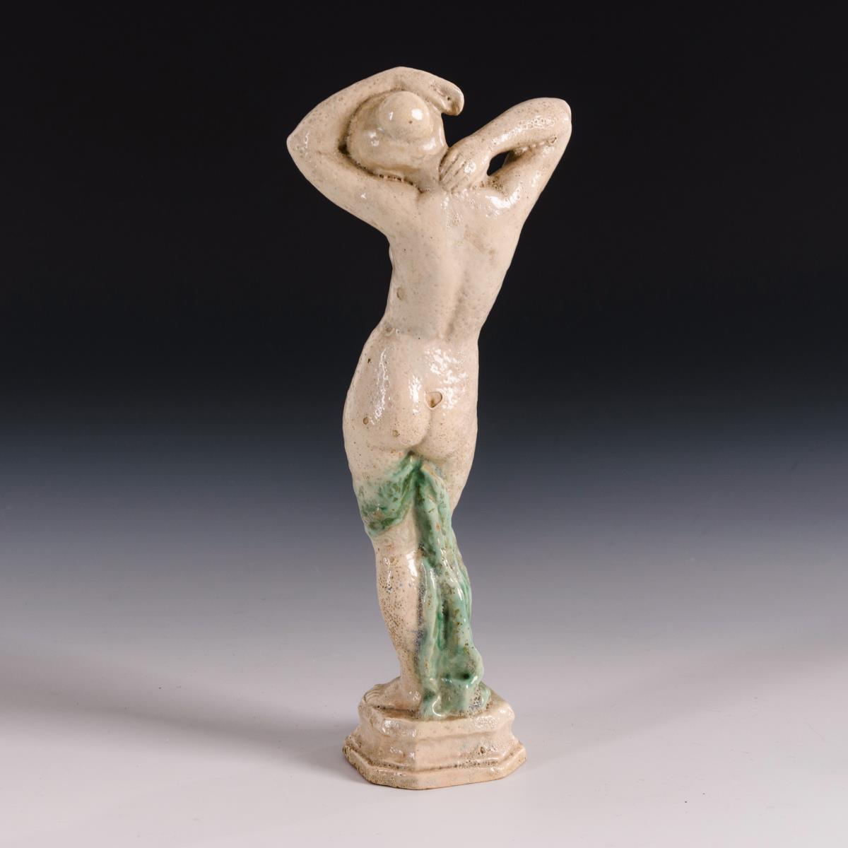 Heller Scherben, blasig weiß und grün glasiert. H 26 cm.