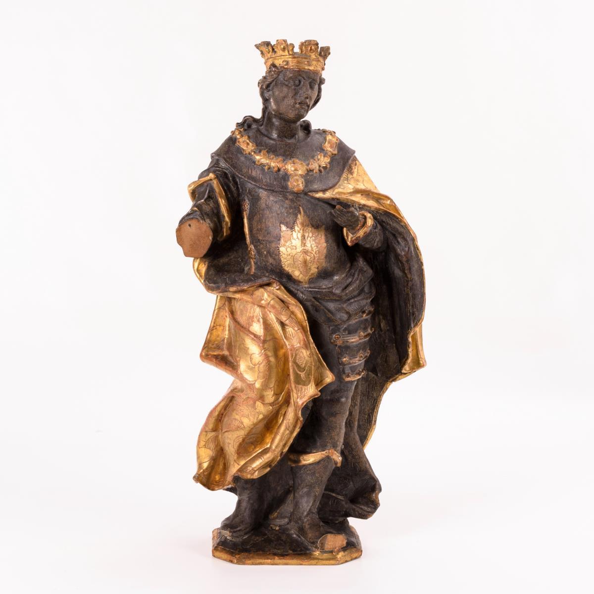 Stehender Weiser aus einer Anbetungsgruppe mit Krone, Rüstung und goldenem Mantel. 1 Unterarm fehlt, weitere kleinere Fehlstellen, Anobienspuren und Trockenrisse hinten, Alters-/Gebrauchsspuren.