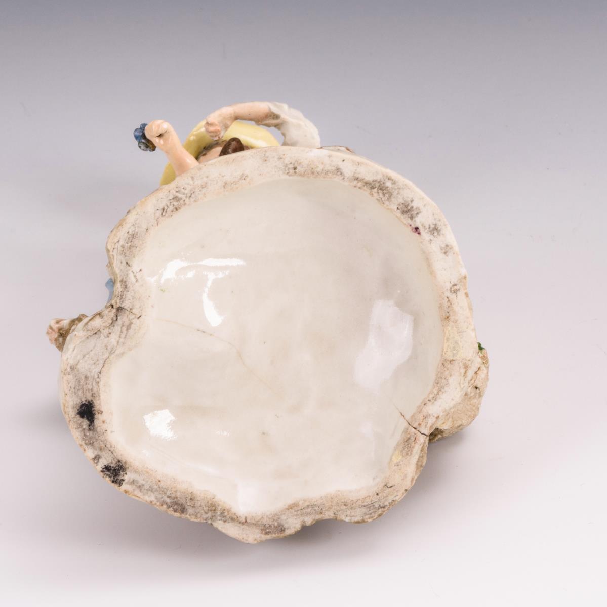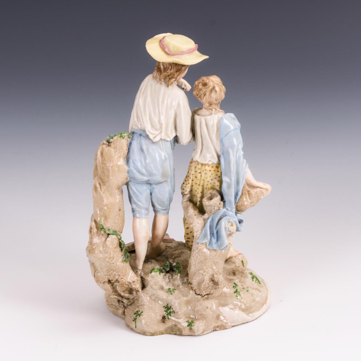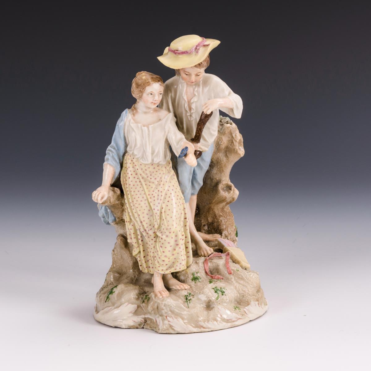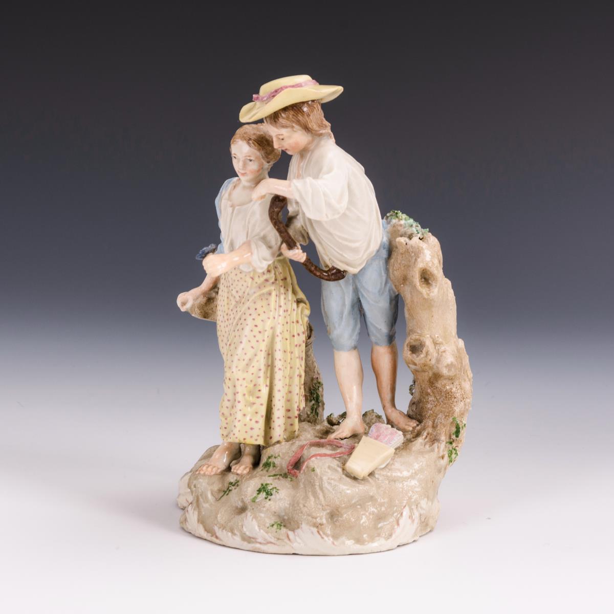 Mädchen mit Blüte und Knabe mit Bogen und Pfeilen. Oberteil Bogen, Hutkrempe und linke Hand der Dame restauriert, partiell Brandrisse.