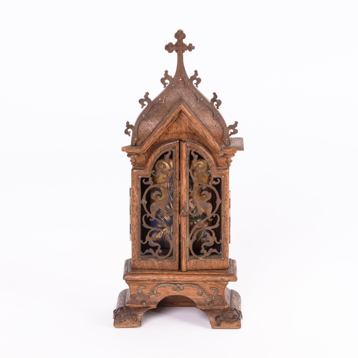 Doppeltüriger Schrein in gotischer Form; innen Plakette mit der Muttergottes der Passion. Einige Alters-/Gebrauchsspuren.