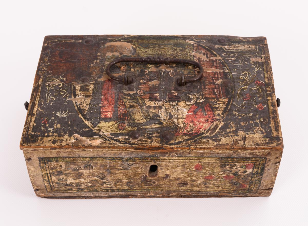 Buchenholz polychrom gefasst, teils mit Wismut, Messing, Eisen, Leder mit Federkielstickerei. Kästchen 10 x 28 x 18 cm.