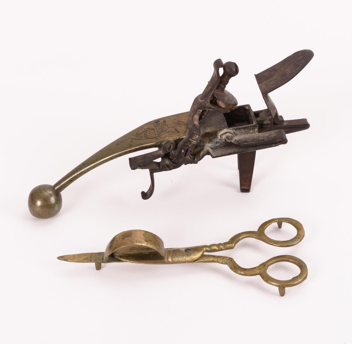Wismutkästchen, Feuerzeug, Dochtschere und Geldgürtel.